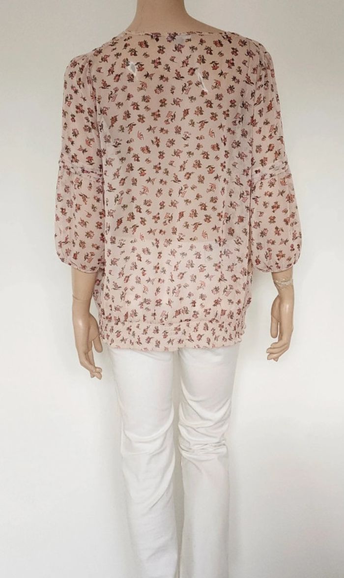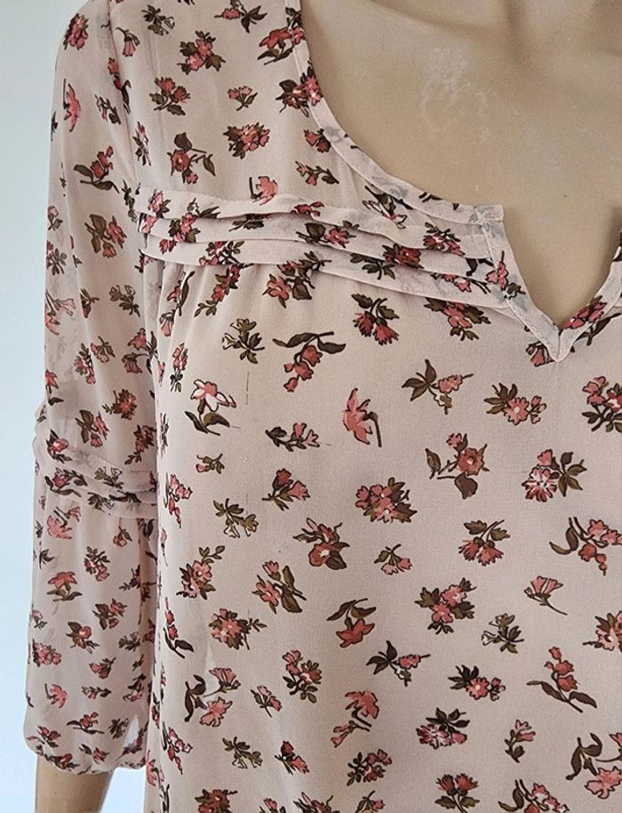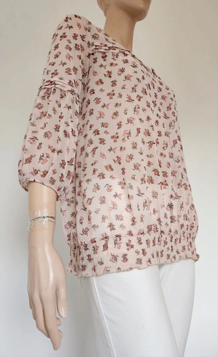 Une blouse à fleurs de 67cm de long Largeur épaules 39cm Aisselles à aisselles 54cm ⚠️ une maille tirées au niveau de la poitrine ( voir photo )