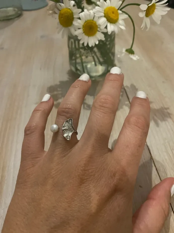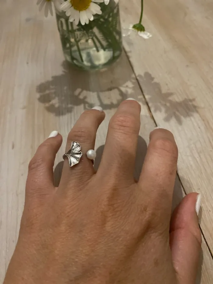 Bague Gingko argent et perle - Taille ajustable (52-54) - photo numéro 1