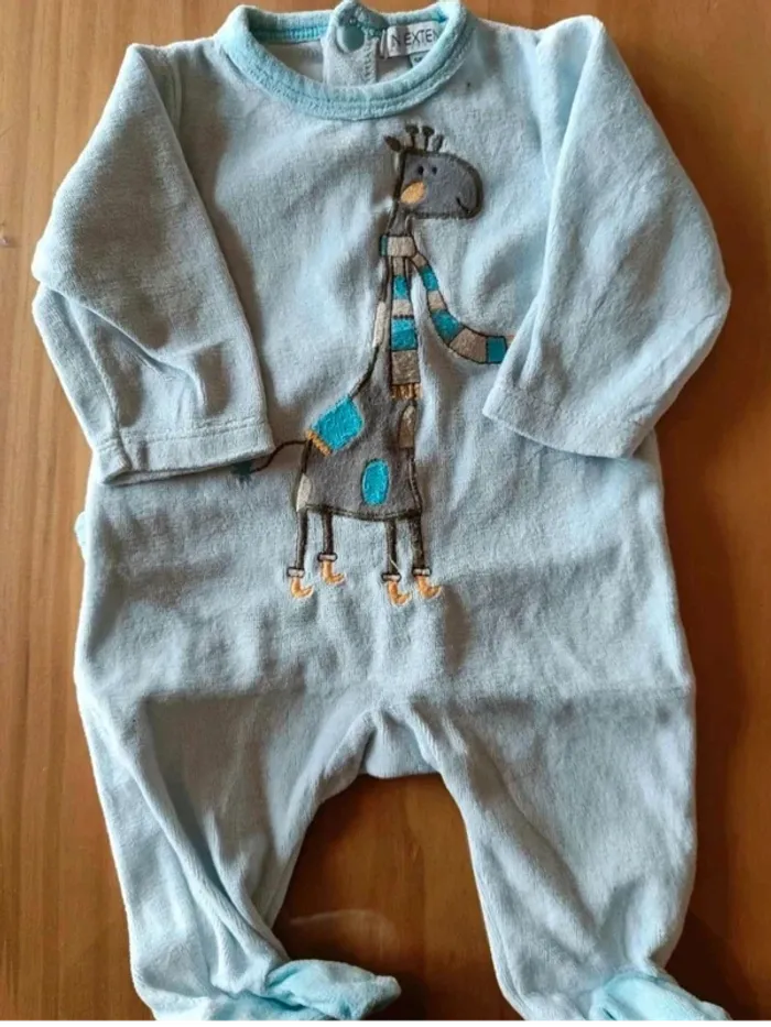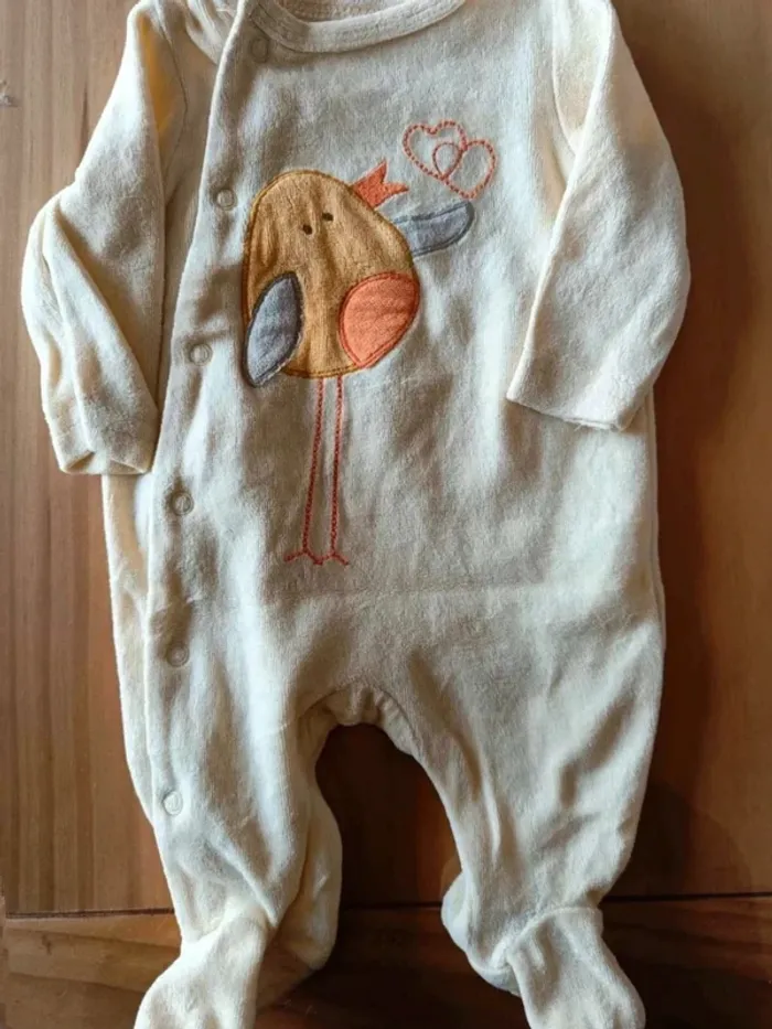 Pyjama jaune taille naissance (taille 0). Ouverture par devant. Pas de marque. Pyjama bleu : taille 1 mois. Marque in extenso.