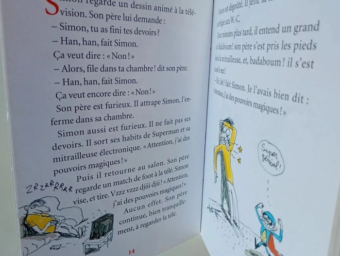 Temps de préparation : très rapide. Recette : prenez (dans le désordre) un cartable, un costume de Superman, quelques copains, un loup, des étoiles, une sorcière, un ogre, un orage, et puis aussi du ketchup, de la mousse au chocolat... Mélangez et secouez énergiquement. Servez très relevé, accompagné d'une bonne dose d'amour, d'une rasade d'humour, d'un zeste de frisson et d'une grande envie de rêver. Dégustez sans attendre. Éditeur ‏ : ‎ Editions Milan 78 pages Âge de lecture ‏ : ‎ 6 - 8 ans Dimensions ‏ : ‎ 12.5 x 1 x 18 cm Livre en très bon état #histoirescourtes #humour