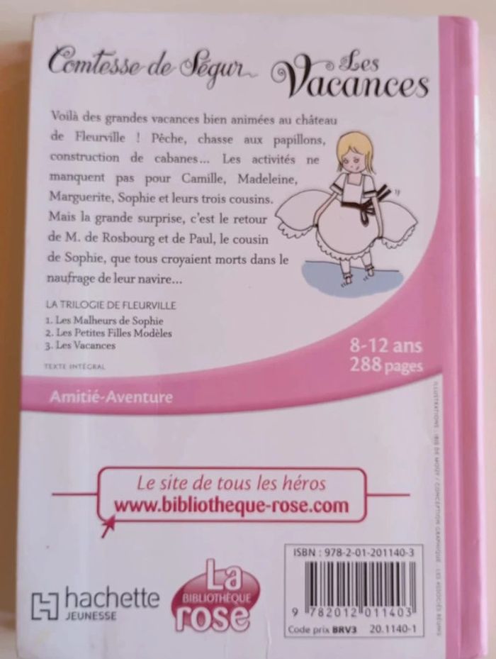 L'été est enfin arrivé, avec son lot de drames, de bêtises et de joies ! Pour les vacances, Camille, Madeleine, Marguerite et Sophie se trouvent réunies avec leurs trois cousins au château de Fleurville. À bâtir des cabanes, chasser les papillons et courir dans les bois, on ne voit pas le temps passer... Éditeur ‏ : ‎ Hachette Bibliothèque rose 288 pages Âge de lecture ‏ : ‎ 8 - 11 ans Dimensions ‏ : ‎ 12.7 x 1.8 x 17.8 cm Livre en très bon état (Légères striures sur la couverture) Je vends d'autres livres sur les vacances #phil_peg_vacances ou de la comtesse de Ségur #phil_peg_ségur #vacances #été #comtessedeségur