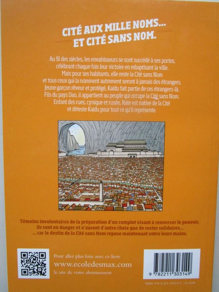 Chaque nation qui s’empare de la Cité la renomme. Siècle après siècle, des envahisseurs arrivent, s’installent et la Cité change de nom. Mais ses habitants ne laissent pas prendre dans ces luttes incessantes : leur ville est la Cité sans nom, et toute personne qui cherche à la renommer est étrangère. Kaidu est l’un de ces nouveaux arrivants, né d’une famille Dao, le dernier peuple avoir pris le contrôle de la région. Rat, elle, est originaire de la Cité sans nom, et déteste Dao pour tout ce qu’il représente. La passion de Dao pour sa nouvelle ville, où il fait ses classes de soldat de la Citadelle, est la seule chose qui pourra peut-être les rapprocher. Espérons-le, car tandis que des complots se montent, le sort de la Cité sans nom repose entre leurs mains. Editeur ‏: Rue de Sèvres 232 pages Âge de lecture ‏ : ‎ 8 - 12 ans Dimensions ‏ : ‎ 15 x 21 cm Livre en parfait état #phil_peg_écoledesloisirs #phil_peg_ruedesèvres #amitié #complots #enfance #villes #héritageculturel #conquête #tolérance #conflit #peuples #politique #guerre #asie