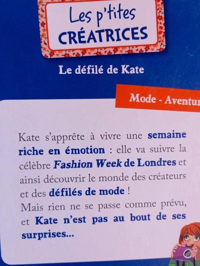 Kate s'apprête à vivre une semaine riche en émotions : elle va suivre la célèbre Fashion Week de Londres et ainsi découvrir le monde des créateurs et des défilés de mode ! Mais rien ne se passe comme prévu, et Kate n'est pas au bout de ses surprises... Éditeur ‏ : ‎ AUZOU 60 pages Âge de lecture ‏ : ‎ 7 - 8 ans Dimensions ‏ : ‎ 14 x 0.7 x 18.5 cm Livre en excellent état Je vends d'autres premiers romans #phil_peg_premiersromans #auzou #ptitescréatrices #premiersromans