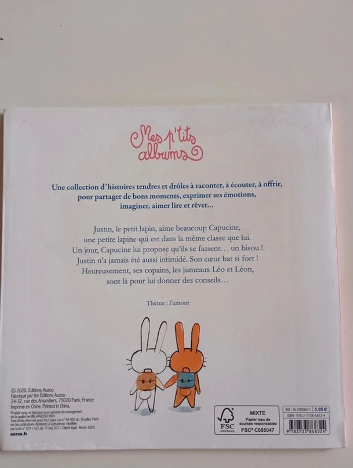 Un très bel album tendre et poétique sur la découverte du sentiment amoureux. Un joli clin d'œil avant la Saint-Valentin ! Justin est amoureux de Capucine, une petite lapine de sa classe. Et un jour, elle lui propose de lui faire un bisou... Malgré les conseils de ses copains Léo et Léon, Justin est très impressionné. Comment va-t-il être à la hauteur... Éditeur ‏ : ‎ AUZOU 32 pages Âge de lecture ‏ : ‎ 3 - 6 ans Dimensions ‏ : ‎ 21.5 x 0.6 x 21.5 cm Livre en bon état (Marque sur la couverture. très bon état intérieur) Je vends d'autres livres de la même collection #phil_peg_mesptitsalbums #mesptitsalbums #lapin #saintvalentin