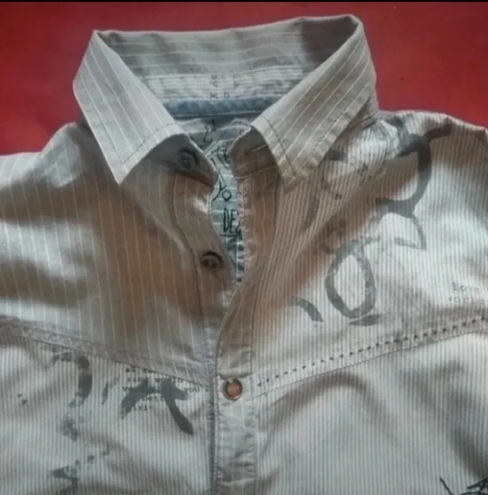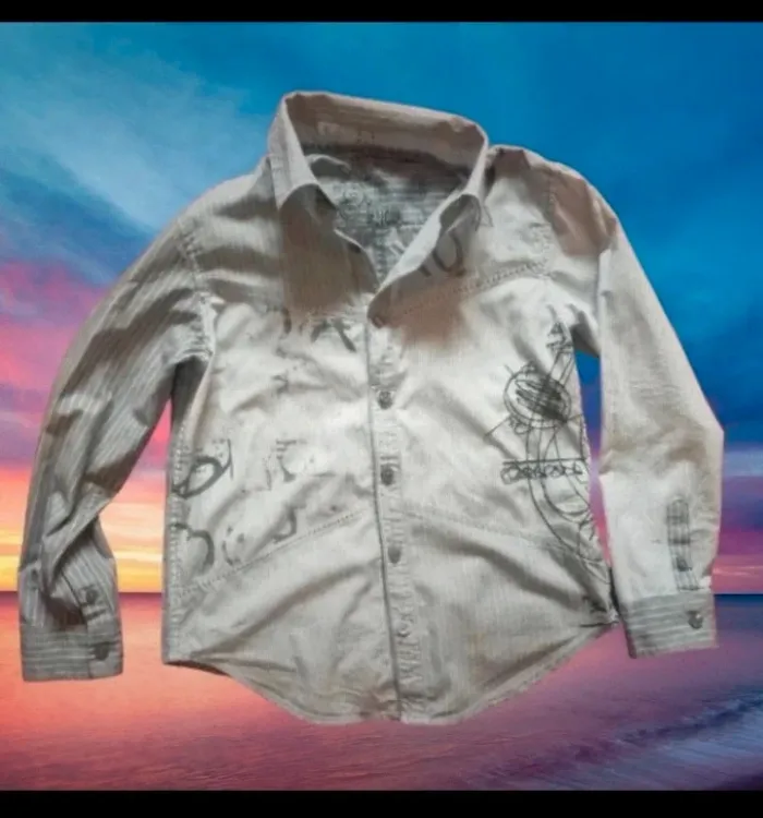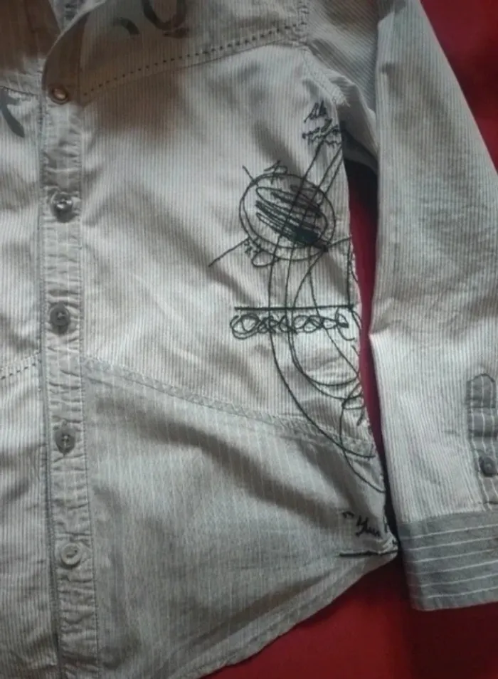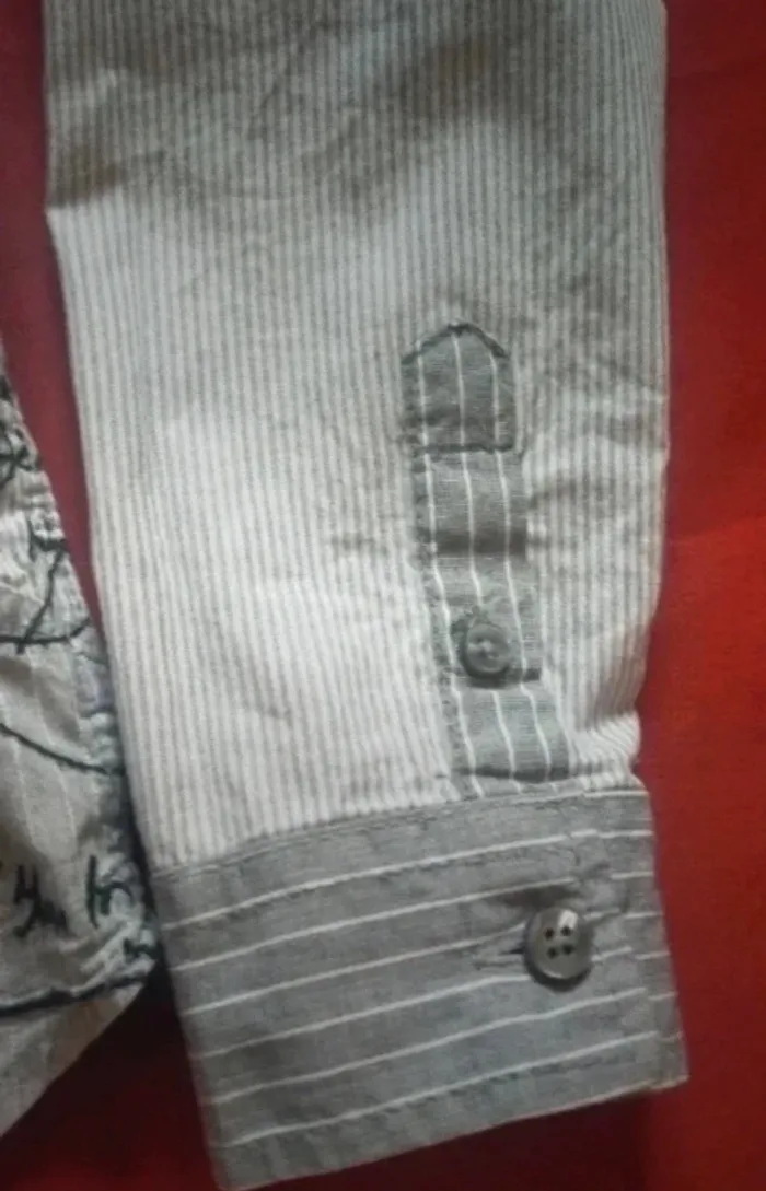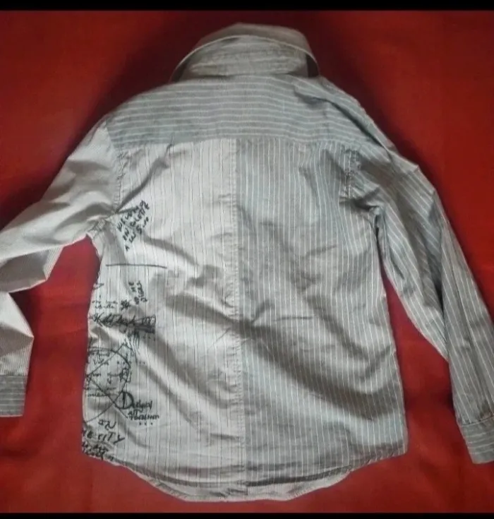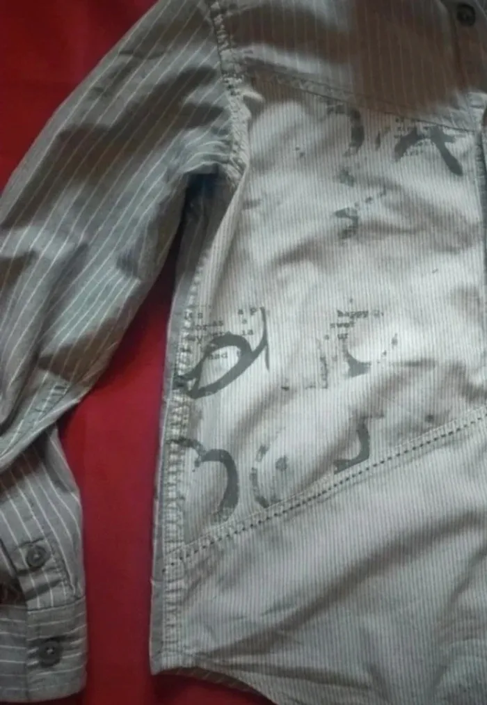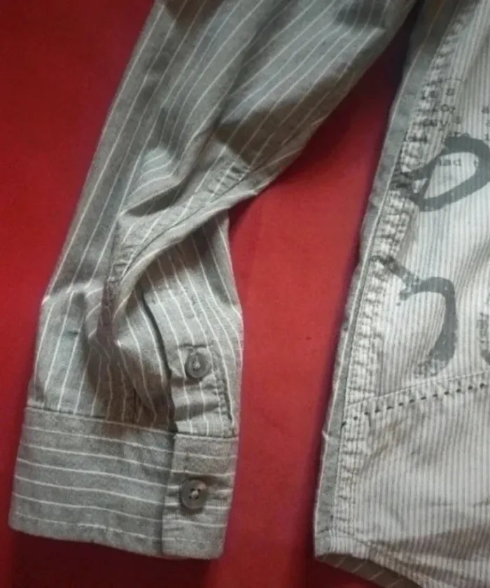 Jolie chemise à manches longues Rayures gris et blanc. Boutons plus pression. Marque desigual taille 6-8 ans Pour des occasions comme baptême mariage ou même tout simplement pour tout les jours Porté pour une seul occasion, comme neuve