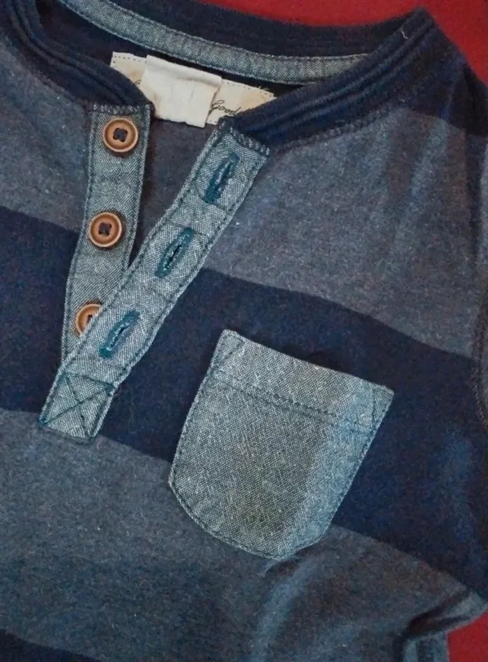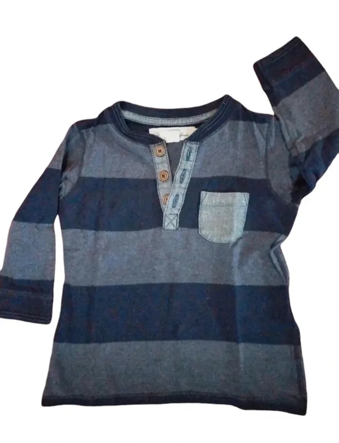 T-shirt manches longues rayures bleu et marines. Col rond avec boutons 100% coto. Excellent état. Taille 9-12 mois 80 cm h&m