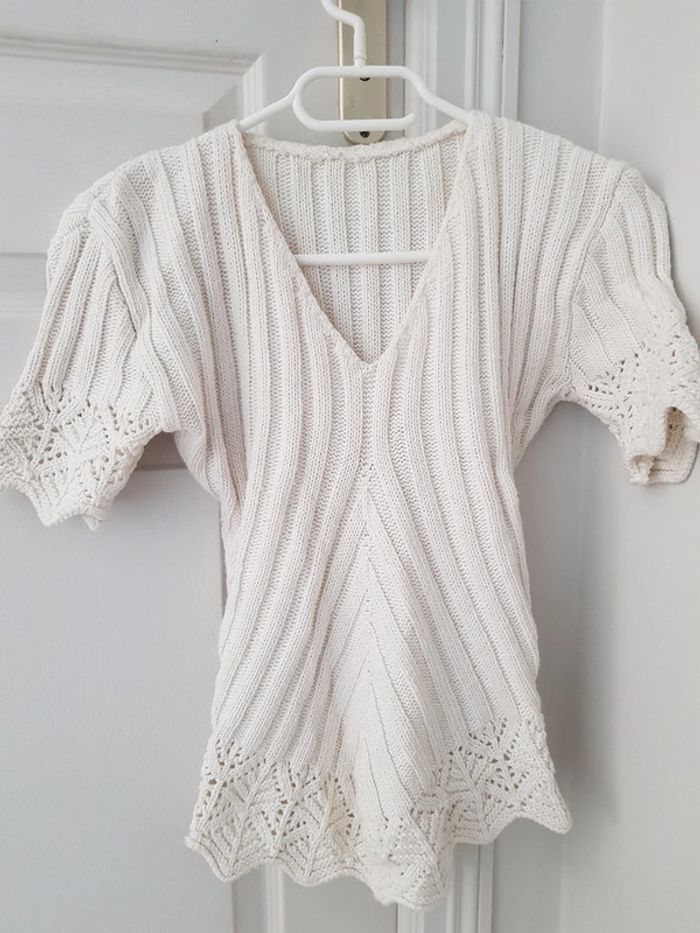 Pull ajouré, col V, manches courtes, belles finitions.