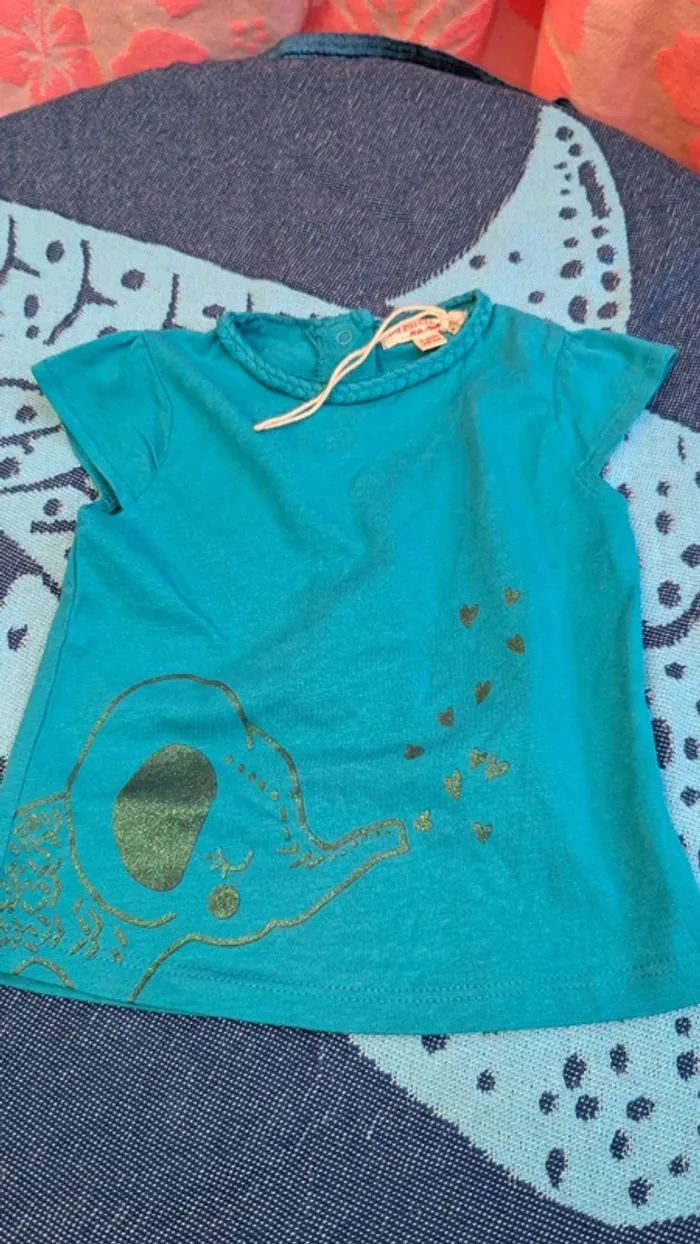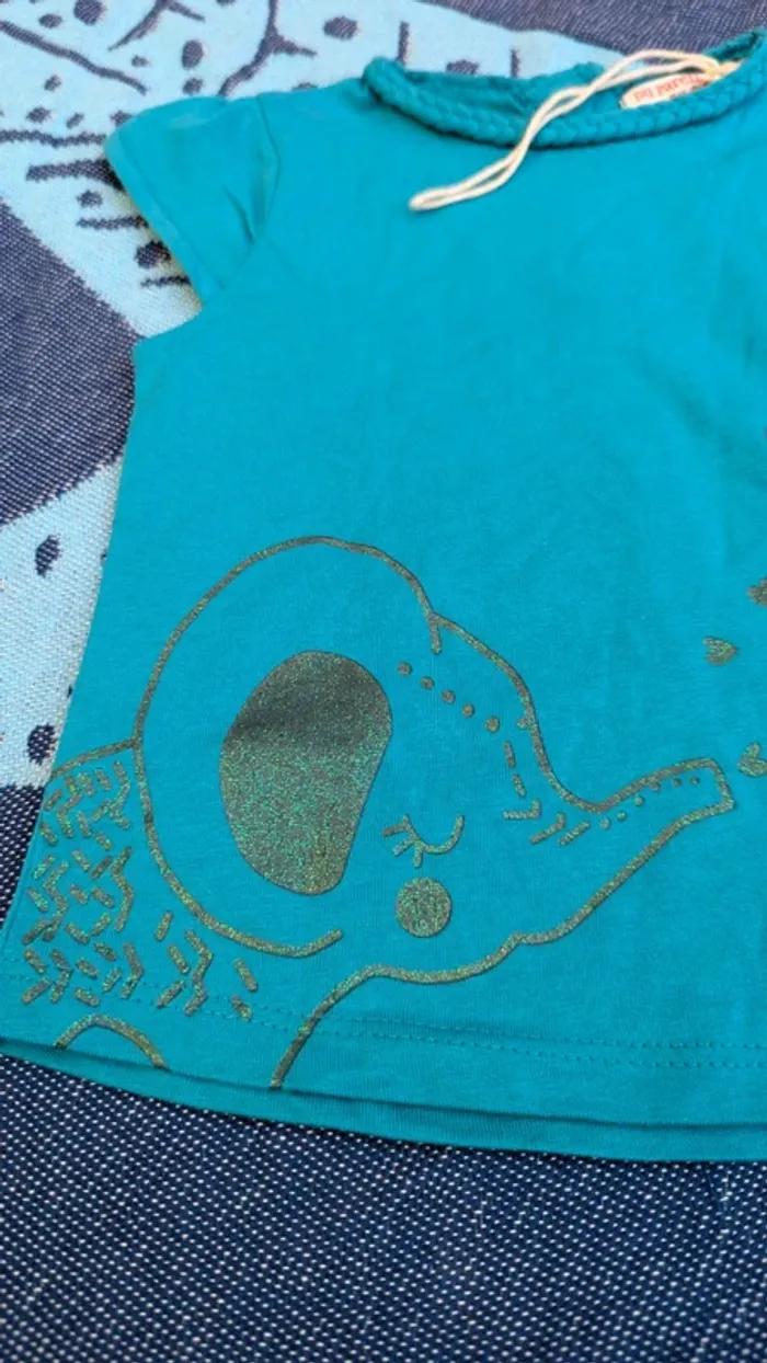 #anamel6m : lots➡️réductions T-shirt Du pareil au même bleu-vert profond avec encolure tressée, petites manches et imprimé scintillant éléphante avec cœurs. 3 boutons pressions au dos 100% coton