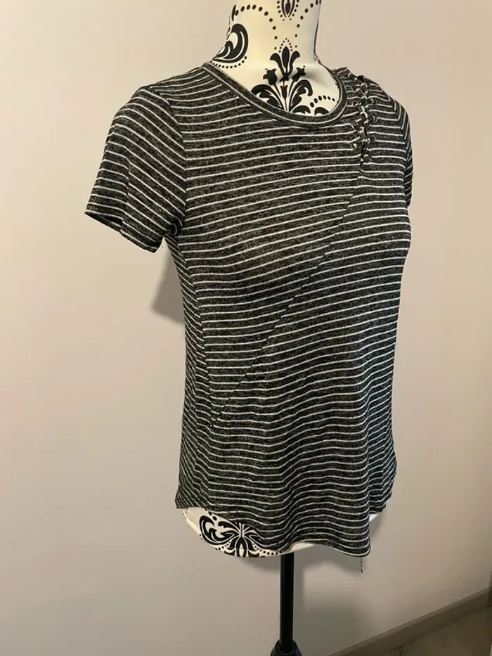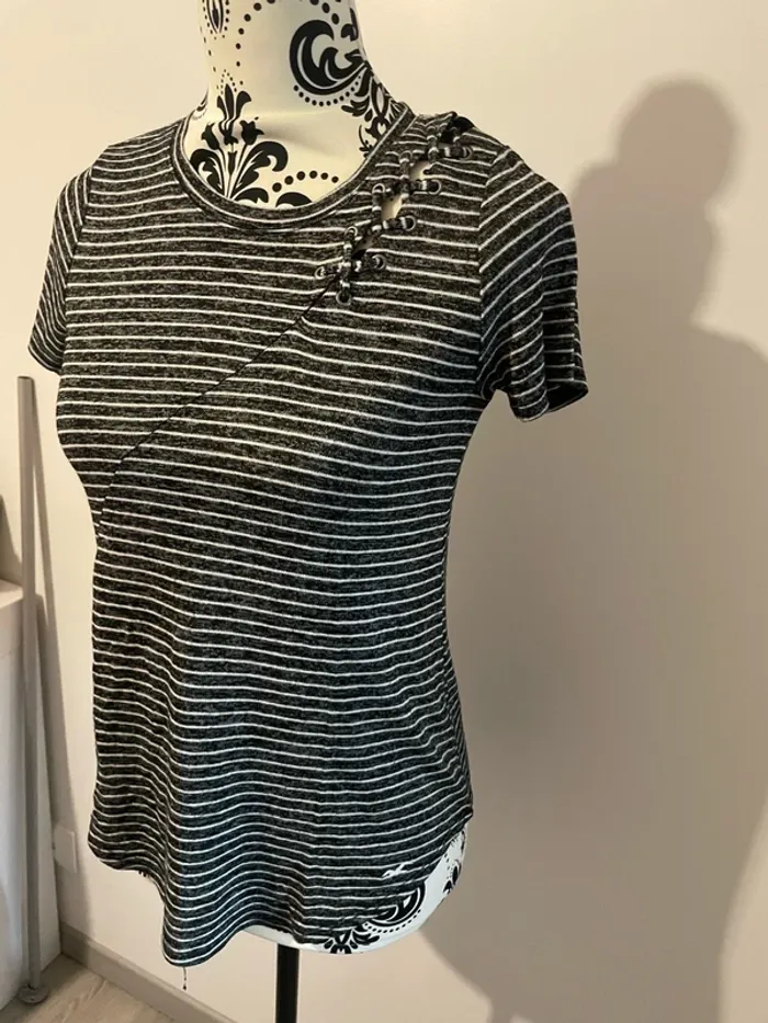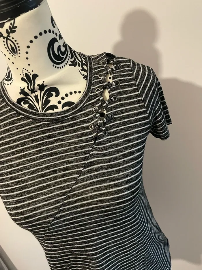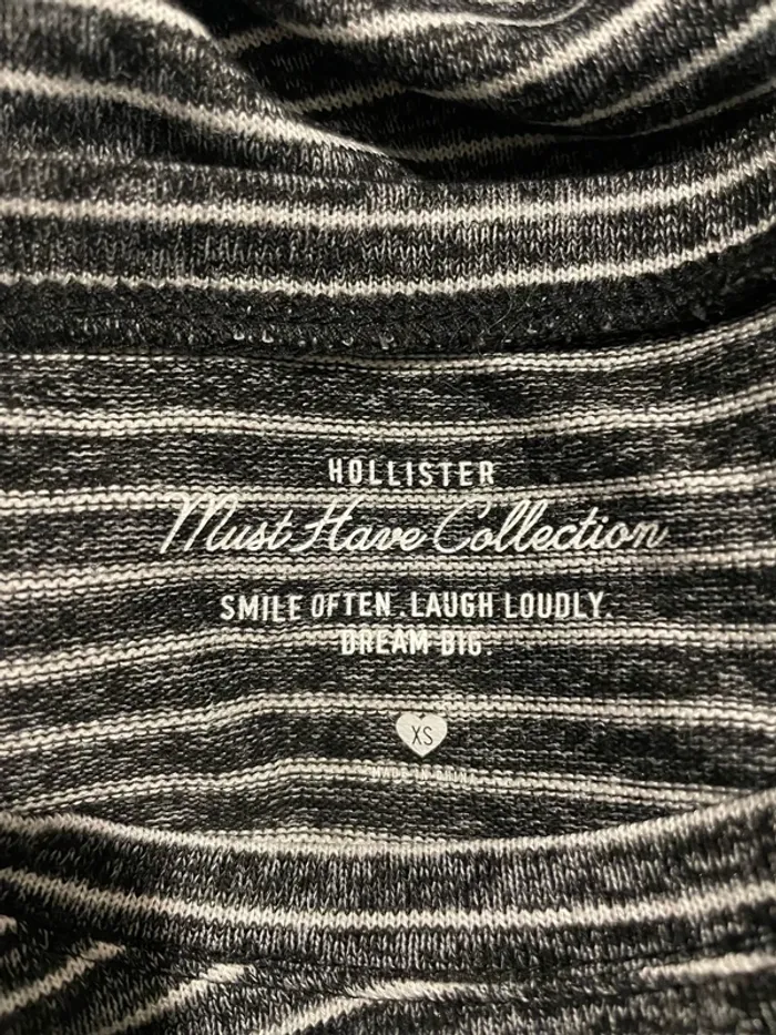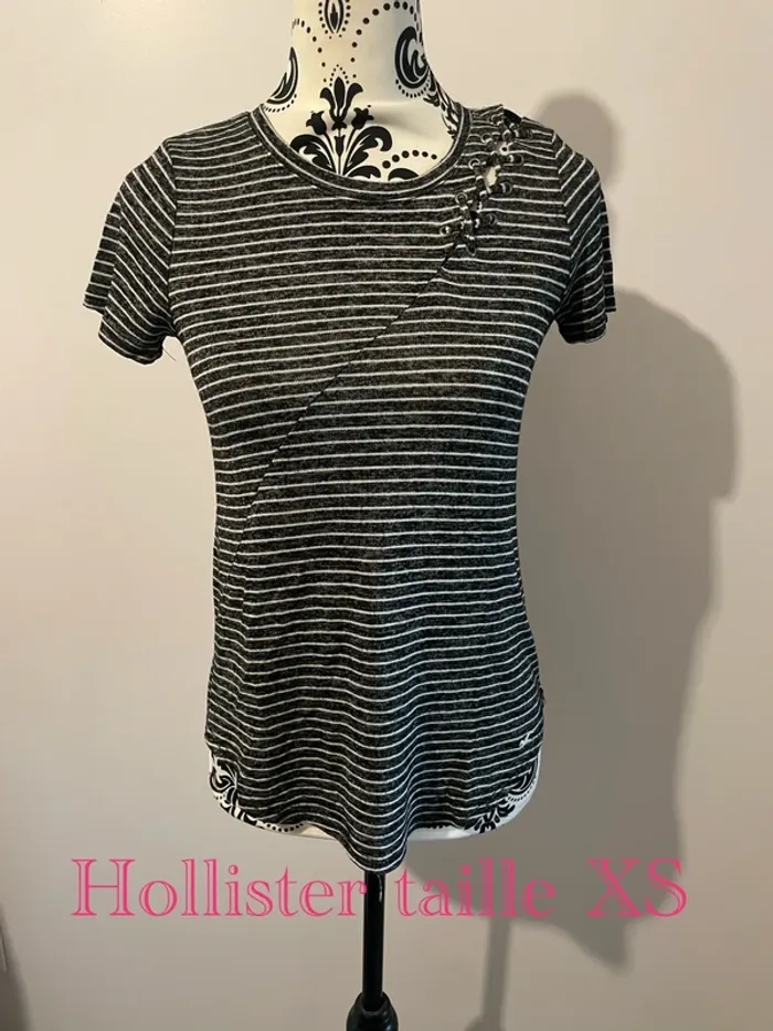 Bonjour je vends mon T-shirt à manches courtes noir rayure blanc lacet col rond Hollister taille XS Il est en excellent état très peu porté #tiatia_femme_taille34