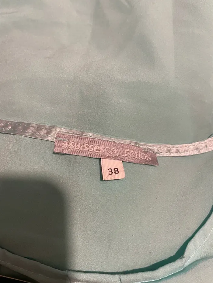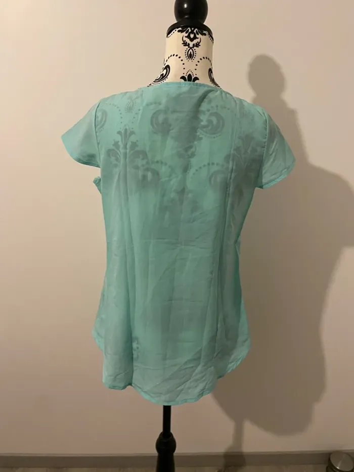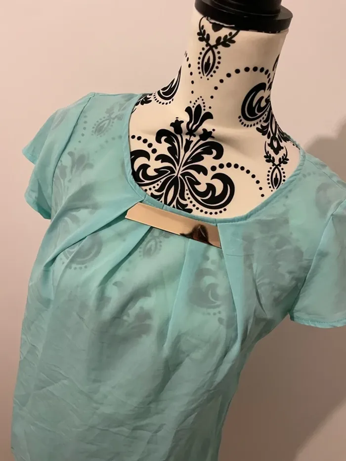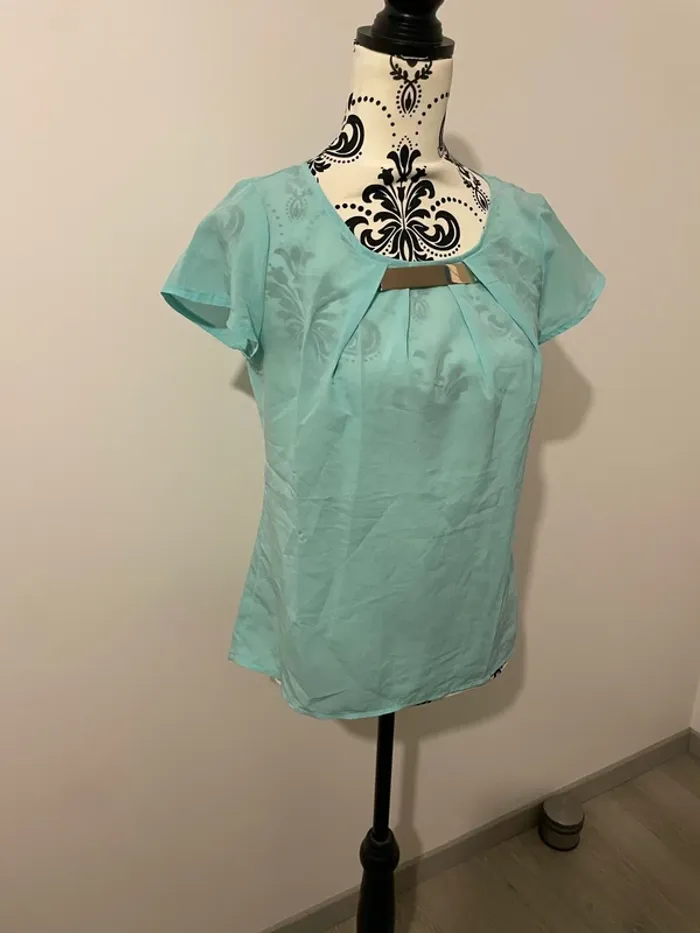Bonjour je vends ma Blouse à manches courtes col rond bijoux collier bleu turquoise et doré 3 suisses taille 38 Elle est en très bon état très peu porté #tiatia_femme_taille38