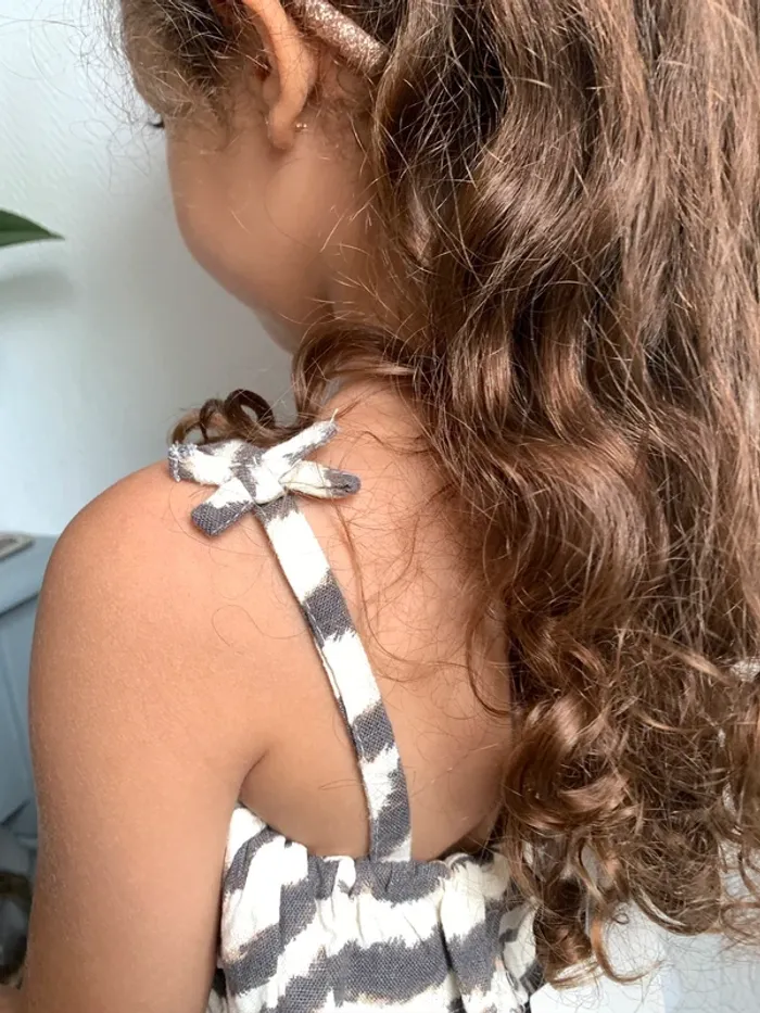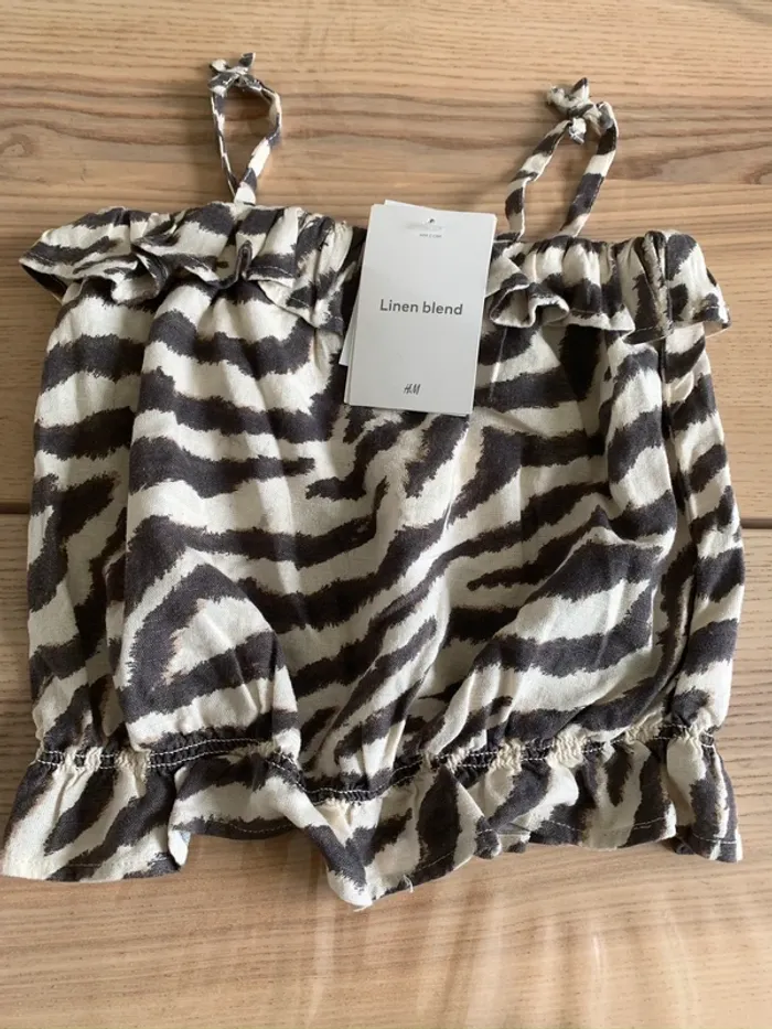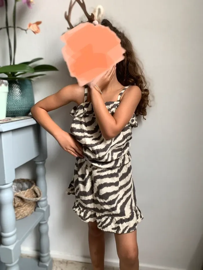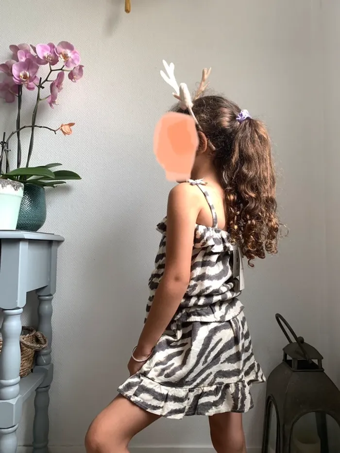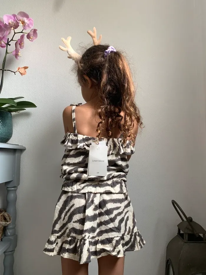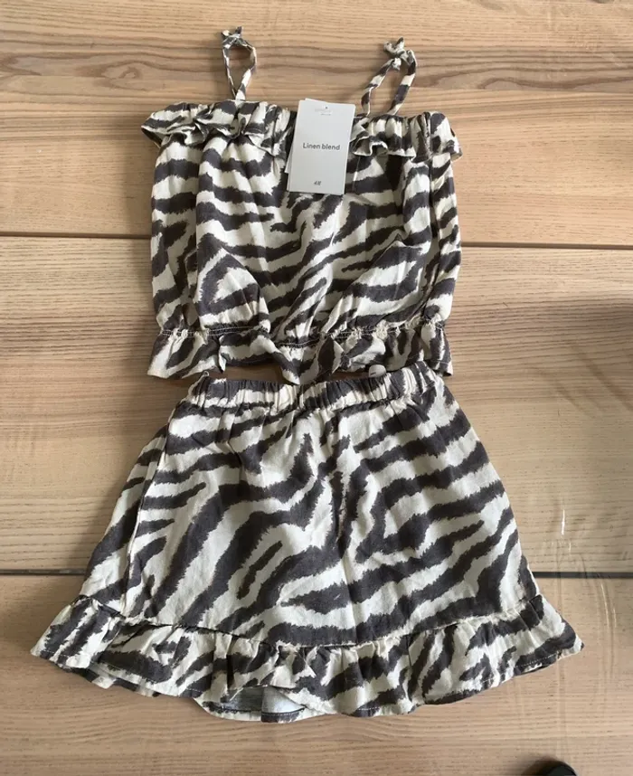 Très bel ensemble top + jupe en Lin Couleur marron beige motif zébré Jolis détails noeud aux épaules ♥️ 15€ neuf avec étiquette #ensembleenlin #ensembledété #lin #taille3-4ans #ensembletaille3-4ans