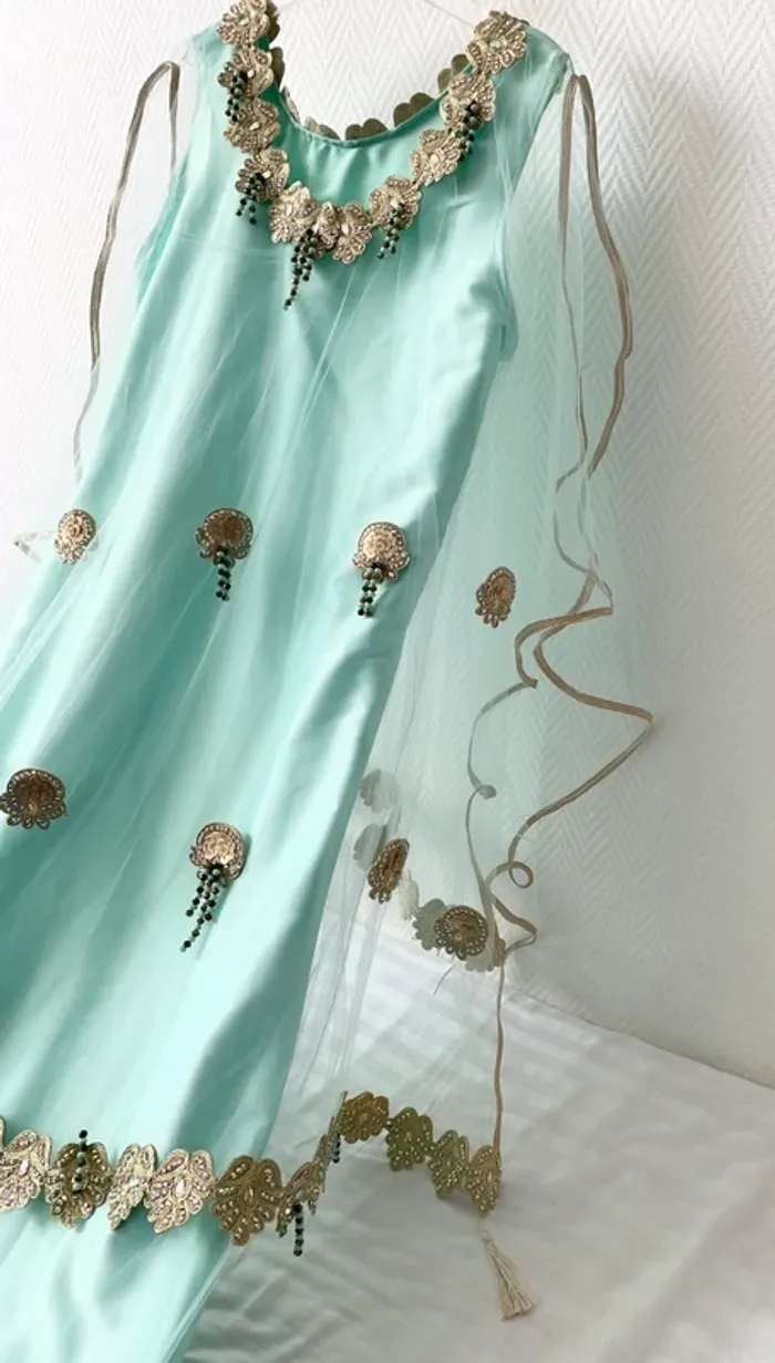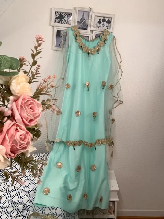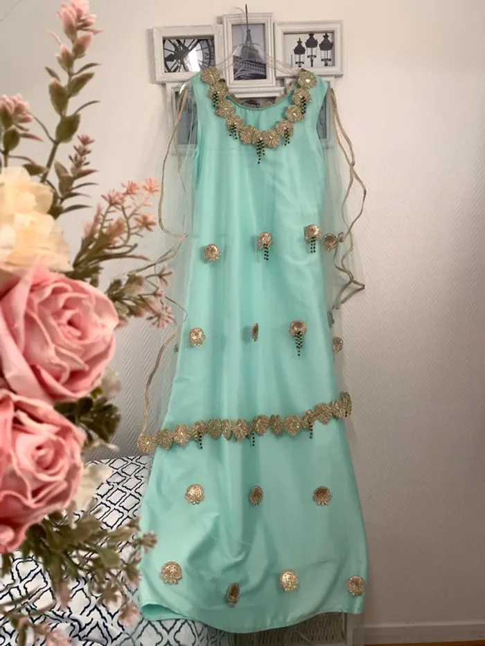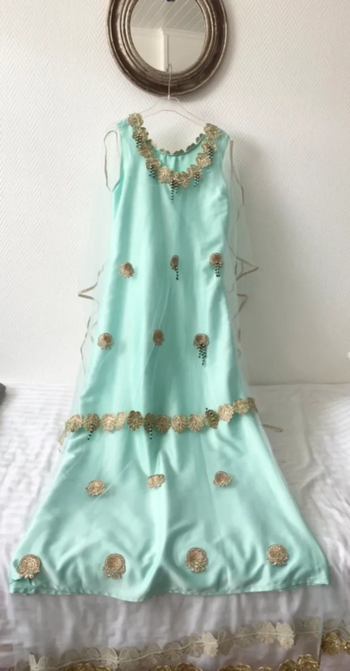 Magnifique robe orientale bohème champêtre Robe typique Chawiya Idéale pour des fiançailles ou pour un mariage Neuve Taille 38/40 Couleur vert d’eau et fils dorés. Travail traditionnel avec perles et fils d’or. A saisir 150€ Elle vaut plus de 350€ en boutique de mariage. Mesures prisent à plat : Longueur: robe satin 148cm + 15cm sur la doublure en tulle Aisselle à aisselle : 48cm Hanches: 52cm #robedusoir #robeété #mariage #mariagechampetre #fiançailles #robefiançailles #robedubai #robeorientale #robechawi #robetraditionnelle #robechawiya #robechawia #robeboheme #robebohemechic #espritvintage