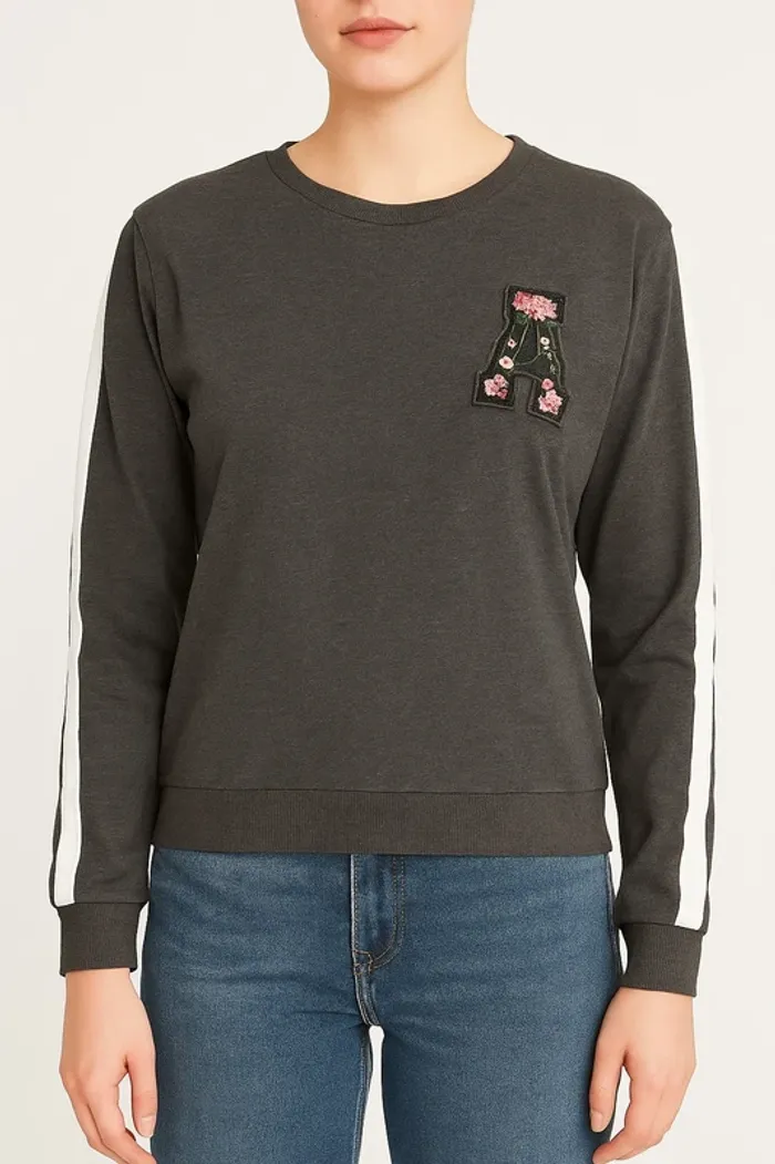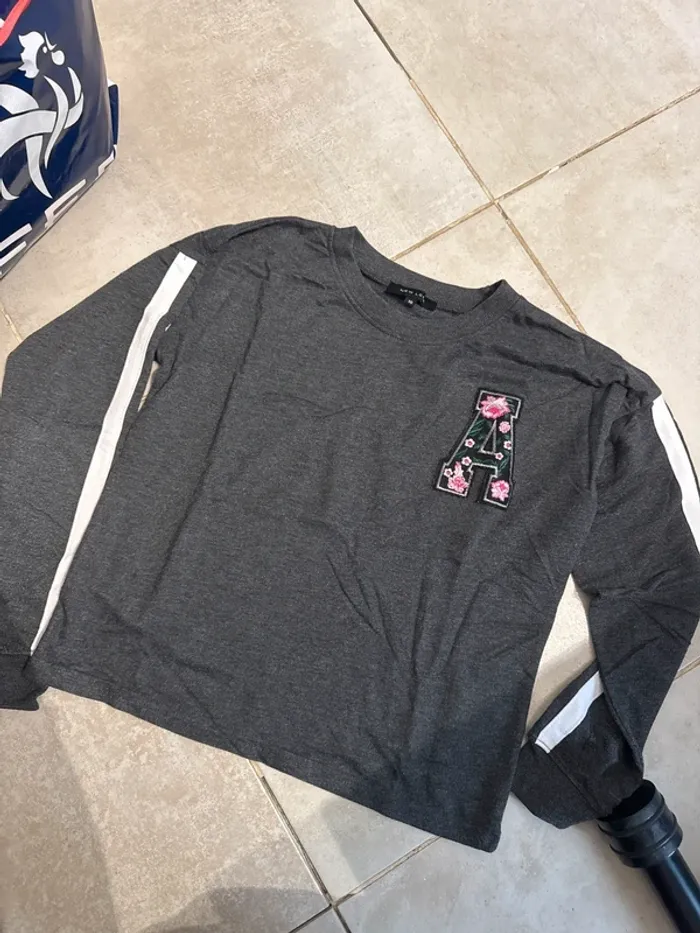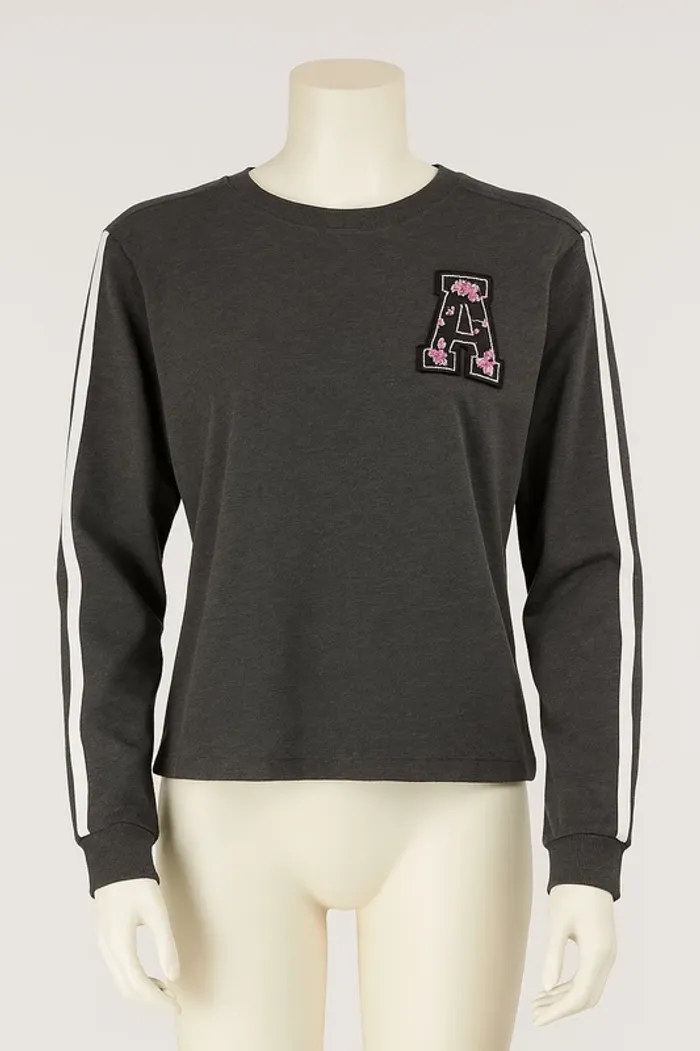 Pull léger gris foncé avec détails sportifs et broderie fleurie : • Bande blanche sur les manches pour un style casual tendance • Broderie en forme de lettre A décorée de fleurs roses • Coupe confortable et légèrement loose, idéale pour un look décontracté État : Bon état, prêt à être porté. Parfait avec un jean ou un short pour un style urbain cool. 🌸