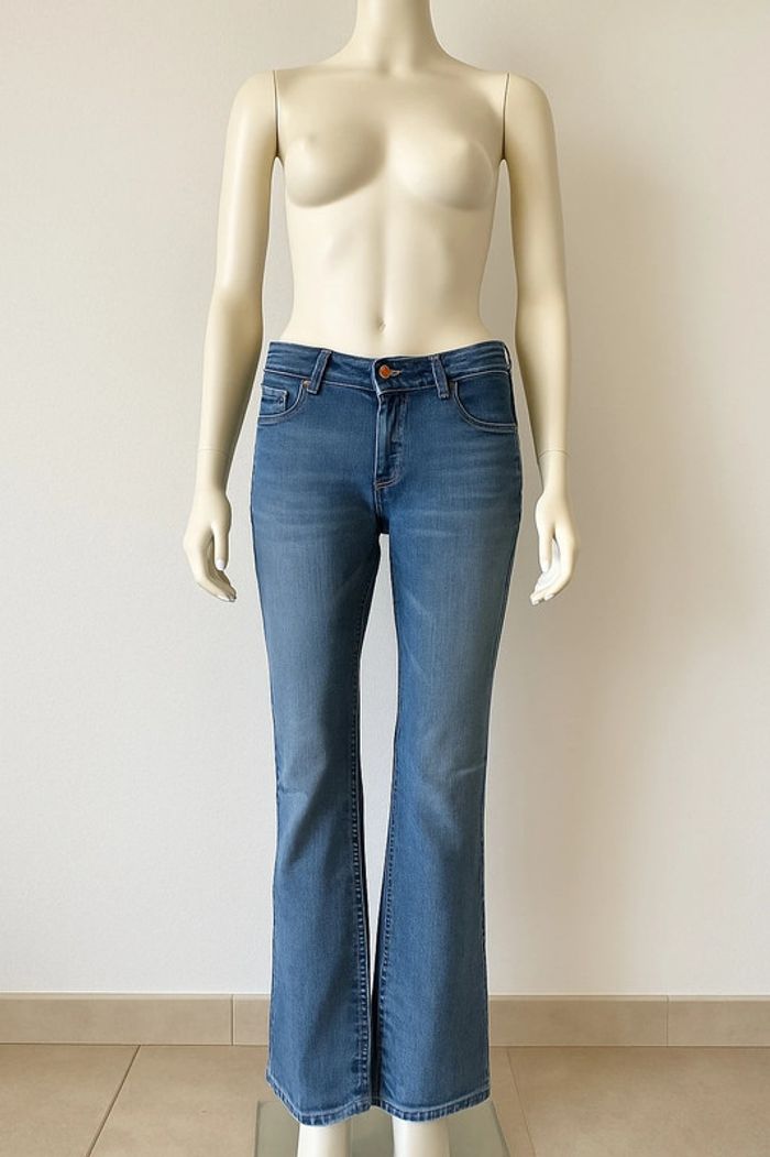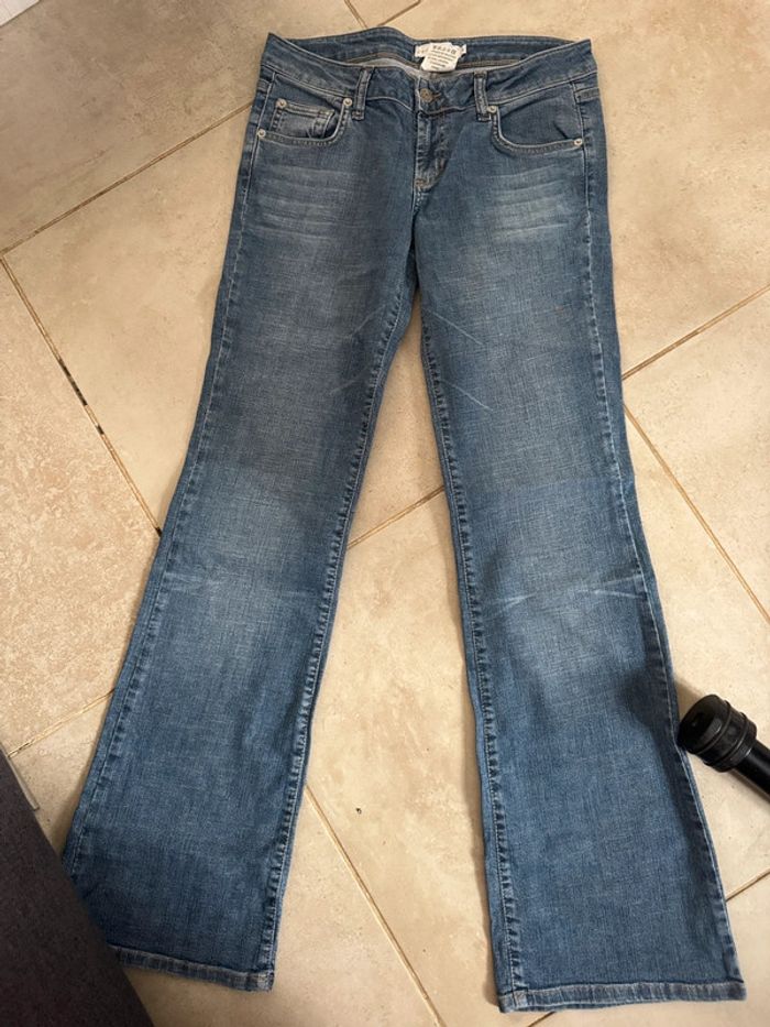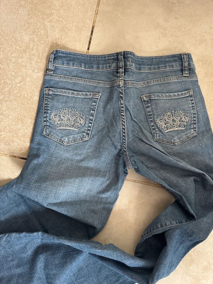 Jean en denim bleu clair de la marque Cache Cache, coupe droite et légèrement évasée en bas. Motifs couronnes brodées sur les poches arrière, apportant une touche originale et féminine. Confortable et bien coupé, il met en valeur la silhouette tout en restant agréable à porter au quotidien. 📏 Taille : 38 👖 Coupe : Droite (bootcut léger) 🎨 Détails : Poches arrière brodées style couronnes 🧼 État : Bon état général (légères traces d’usage visibles sur les photos)