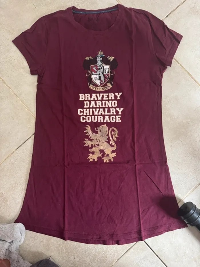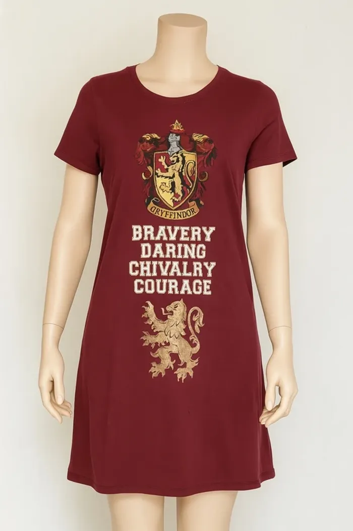 Jolie chemise de nuit bordeaux inspirée de l’univers Harry Potter, mettant à l’honneur la maison Gryffondor avec son blason et son emblématique lion doré.