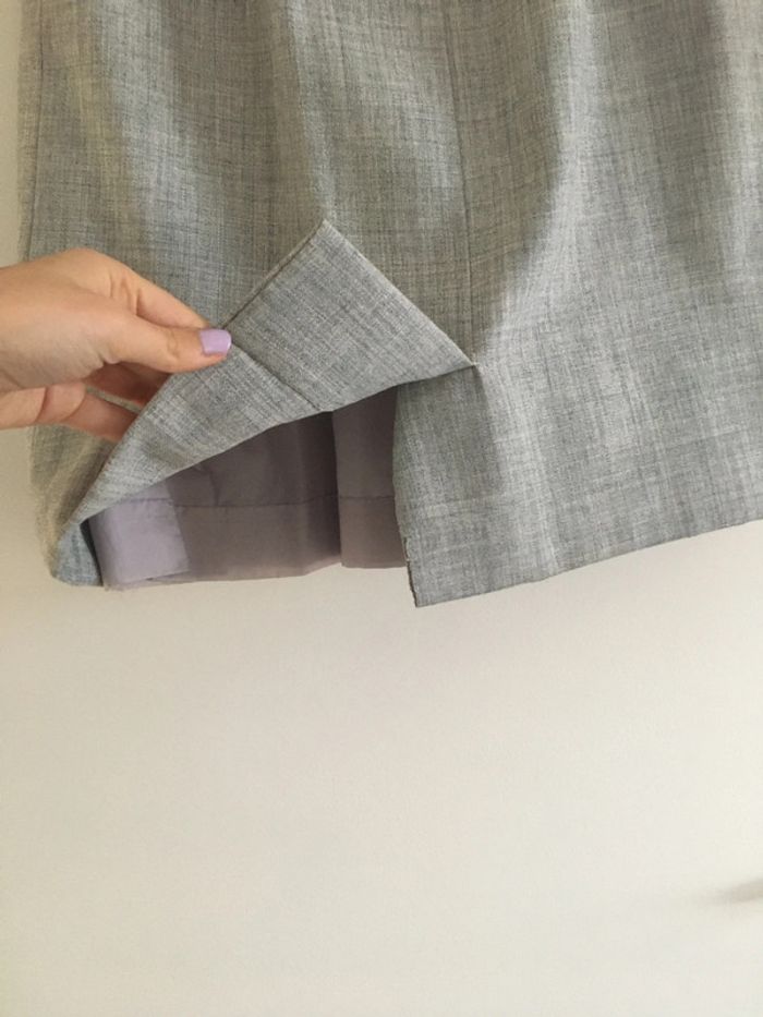 jupe droite gris bleu fendue à l'arrière fermeture tirette à l'arrière longueur 60 cm