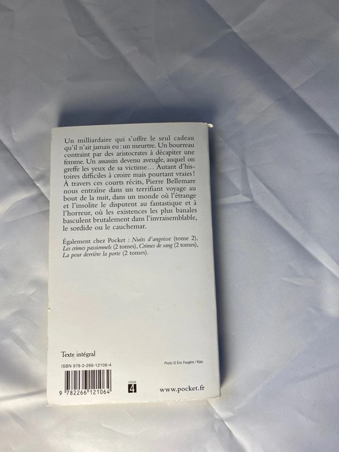 Un milliardaire qui s'offre le seul cadeau qu'il n'ait jamais eu : un meurtre. Un bourreau contraint par des aristocrates à décapiter une femme. Un assassin devenu aveugle, auquel on greffe les yeux de sa victime... Autant d'histoires difficiles à croire mais pourtant vraies! À travers ces courts récits, Pierre Bellemare nous entraîne dans un terrifiant voyage au bout de la nuit, dans un monde où l'étrange et l'insolite le disputent au fantastique et à l'horreur, où les existences les plus banales basculent brutalement dans l'invraisemblable, le sordide ou le cauchemar. Également chez Pocket : Nuits d'angoisse (tome 2), Les crimes passionnels (2 tomes), Crimes de sang (2 tomes), La peur derrière la porte (2 tomes).