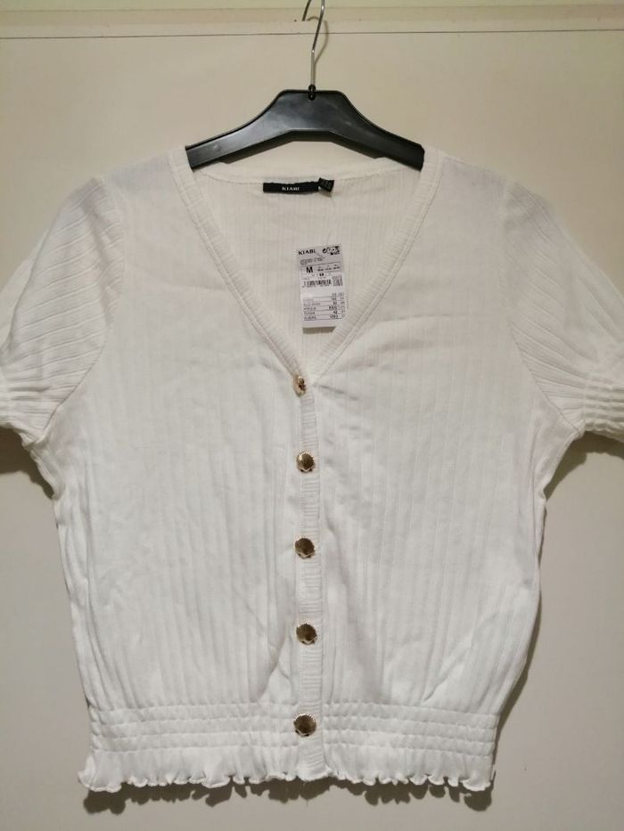 Très jolie haut à mailles avec boutons décoratifs coquillages dorés. Élastique aux manches et à la taille. Neuf avec étiquette.