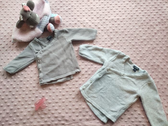 2 gilets, le gris clair taille 1 mois et le foncé 0 mois . Les deux ont été portés les 3 premières semaines de vie de BB