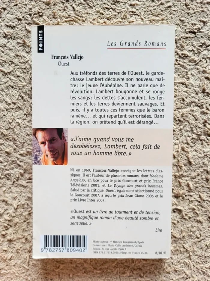 ⭐️ Nombreux livres dans mon dressing réductions sur les lots activées ✨️ 📚 Livre "Ouest" de François Vallejo Lauréat du Prix du Livre Inter 2007 et du Prix Jean‑Giono 2006 📕 Bon état, sans usure Présence de tâches jaunes au début et à la fin du livre 📖 Après la mort du vieux baron dans une Vendée imaginaire sous Napoléon III, Lambert, son garde-chasse fidèle, découvre un nouveau maître en la personne du baron héritier, passionné par des idées politiques républicaines et singulières. Très vite, la cohabitation tourne au huis clos tendu : Lambert, enraciné dans la tradition, et le jeune baron, fantasque et troublant, s’opposent dans une confrontation de personnalités et d’influences, entre forêts silencieuses, rituels de chasse et secrets