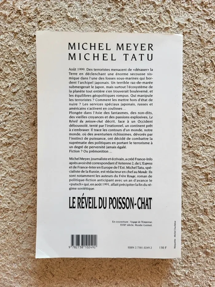 ⭐️ Nombreux livres dans mon dressing réductions sur les lots activées ✨️ 📚 Livre "Le réveil du poisson-chat", un thriller géopolitique de Michel Meyer et Michel Tatu 📕 Couverture et pages en très bon état, sans usure Quelques petites tâches sur la tranche mais intérieur impeccable 📖 Août 1999 : des terroristes menacent de déclencher une gigantesque secousse sous-marine près du Japon pour littéralement "désaxer" la Terre. Ce raz-de-marée pourrait balayer le pays et bouleverser l'équilibre du monde. Deux journalistes (Meyer & Tatu) imaginent un monde gouverné par des riches obsessionnels du chaos, prêts à surpasser les États pour instaurer un terrorisme d’un nouveau type