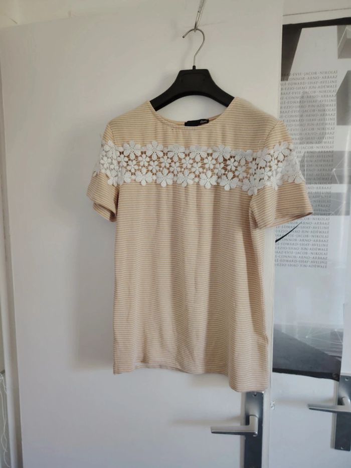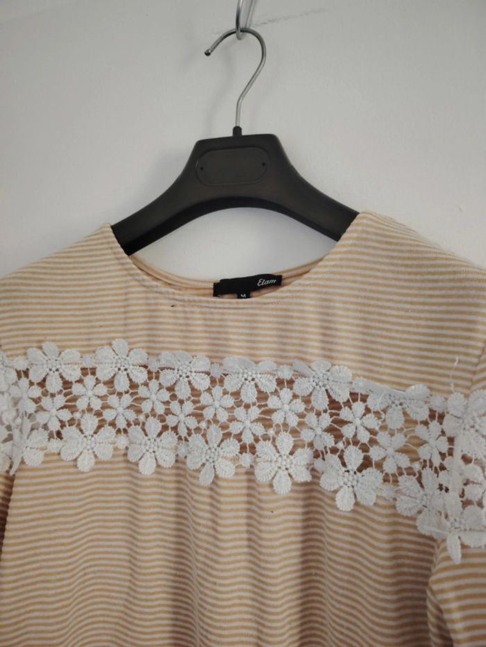 #meganeayrontrentehuit Tee-shirt jaune rayer blanc avec dentelle marque etam taille M