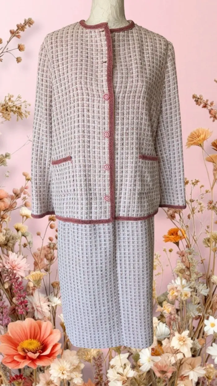 En état irréprochable, ensemble jupe droite/veste droite vintage de très belle qualité, entièrement doublé de satin très doux, ce qui le rend très agréable à porter. Longueur totale de la veste: 63cm, longueur des manches: 55cm. Jupe: taille: 80cm et longueur: 66cm. Couleur vieux rose et crème. MAISON NON FUMEUR 🚭 #38femmeangelinamandine #40femmeangelinamandine #ensemblechicfemme #ensemblevintagefemme