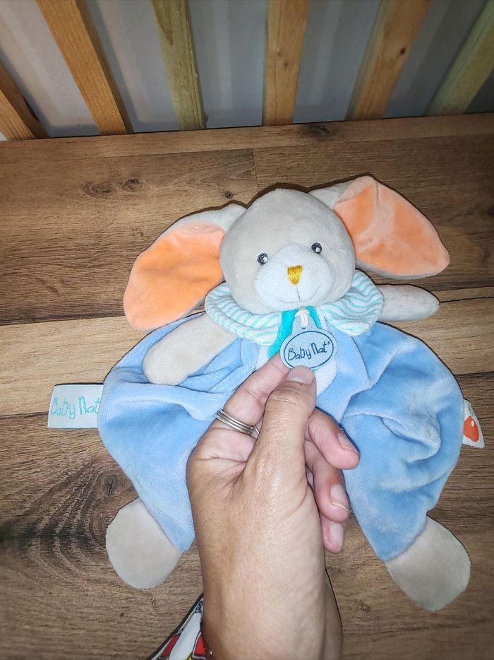 Doudou Lapin Pom Plat Bleu Orange Gris BABY NAT’ Tbe Étiquette marque présente 12.90 euros Envoi en relais