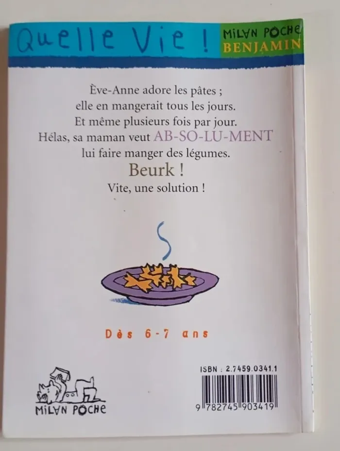 Ève-Anne n'aime que les pâtes. Elle ne voudrait rien manger d'autre. Hélas ! sa maman n'est pas d'accord, et l'oblige à manger aussi de la viande et des légumes. La petite fille en fait des cauchemars la nuit, ça ne peut plus durer ! Alors Ève-Anne a une riche idée : offrir à Maman, pour son anniversaire, un beau livre de cuisine... qui ne propose que des recettes de pâtes ! Éditeur ‏ : ‎ MILAN 24 pages Âge de lecture ‏ : ‎ 6 - 7 ans Dimensions ‏ : ‎ 13 x 0.5 x 18 cm Livre en très bon état Je vends d'autres livres premières lectures #phil_peg_premiereslectures #apprentissagelecture #premièreslectures