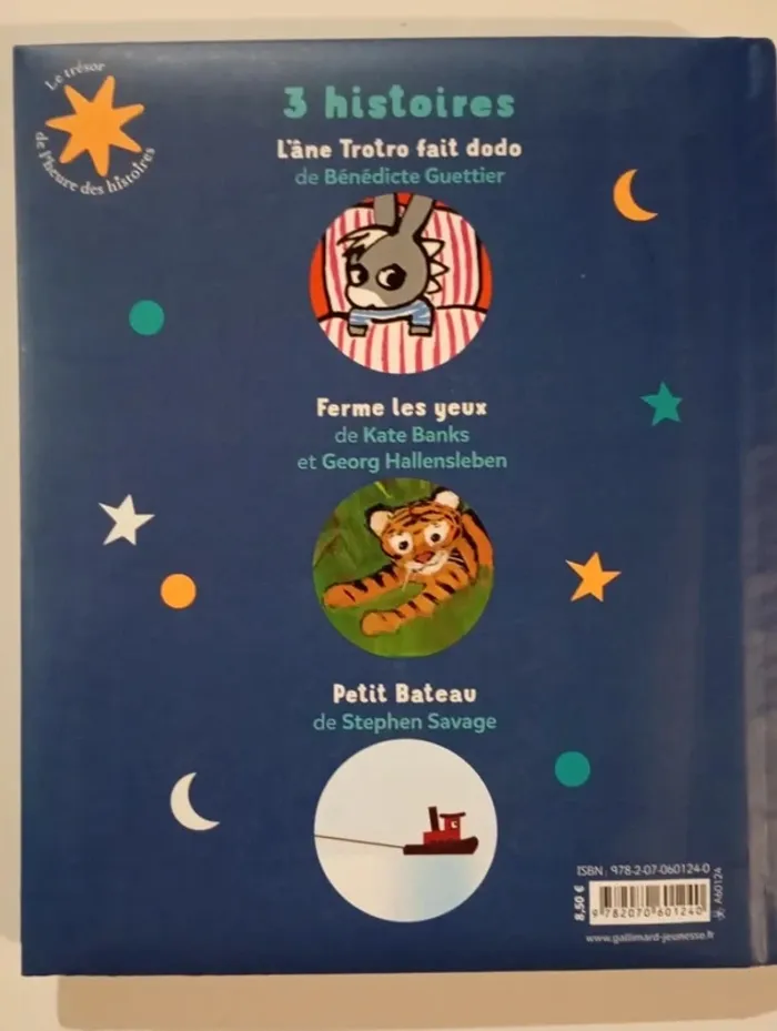 - L'âne Trotro fait dodo de Bénédicte Guettier - Ferme les yeux de Kate Banks et Georg Hallensleben - Petit Bateau de Stephen Savage Éditeur ‏ : ‎ Gallimard Jeunesse 94 pages Âge de lecture ‏ : ‎ 3 - 5 ans Dimensions ‏ : ‎ 17.8 x 1.2 x 21.7 cm Livre en très bon état #lheuredeshistoires #histoiresdusoir