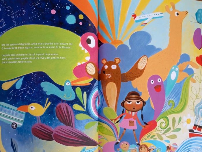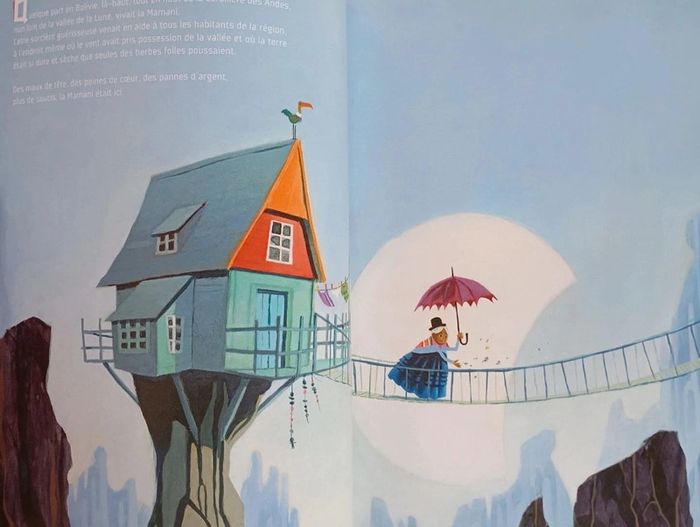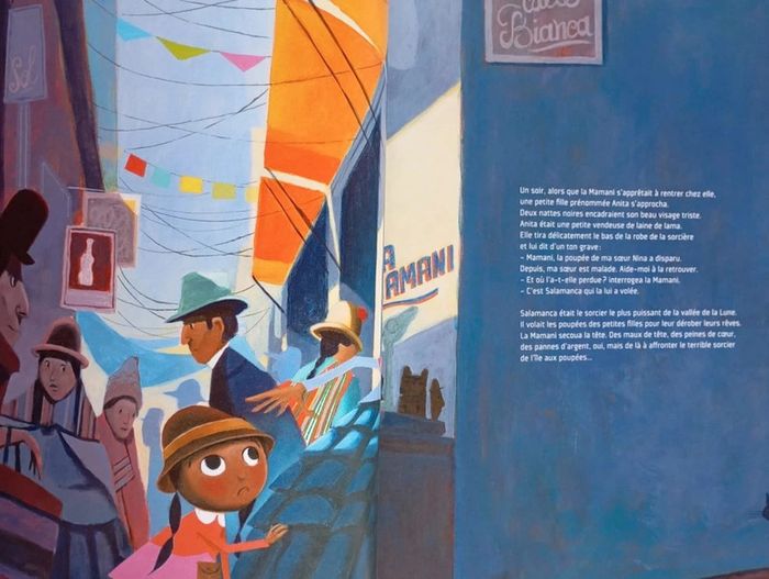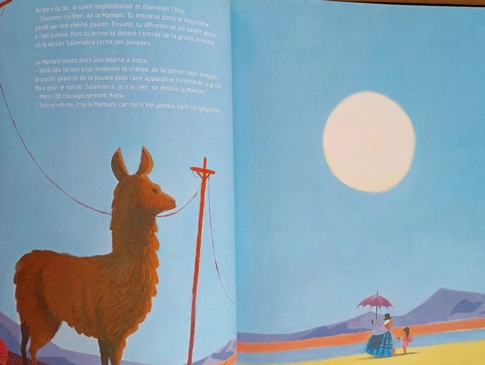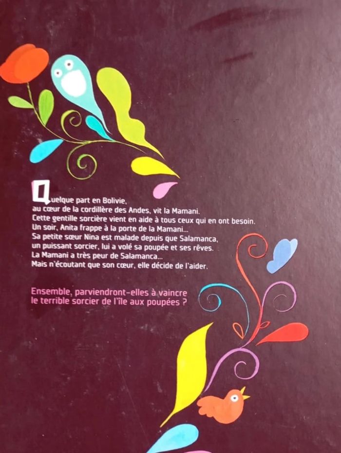 Quelque part en Bolivie, au coeur de la cordillère des Andes, vit la Mamani. Cette gentille sorcière vient en aide à tous ceux qui en ont besoin. Un soir, Anita frappe à la porte de la Mamani... Sa petite soeur Nina est malade depuis que Salamanca, un puissant sorcier, lui a volé sa poupée et ses rêves. La Mamani a très peur de Salamanca... Mais n'écoutant que son coeur, elle décide de l'aider. Editeur : Père Castor Relié ‏ : ‎ 32 pages Âge de lecture ‏ : ‎ 4 - 7 ans Dimensions ‏ : ‎ 24.6 x 0.8 x 30.9 cm Livre en très bon état (Nom à l'intérieur de la couverture) #bolivie #sorcier #rêves #courage