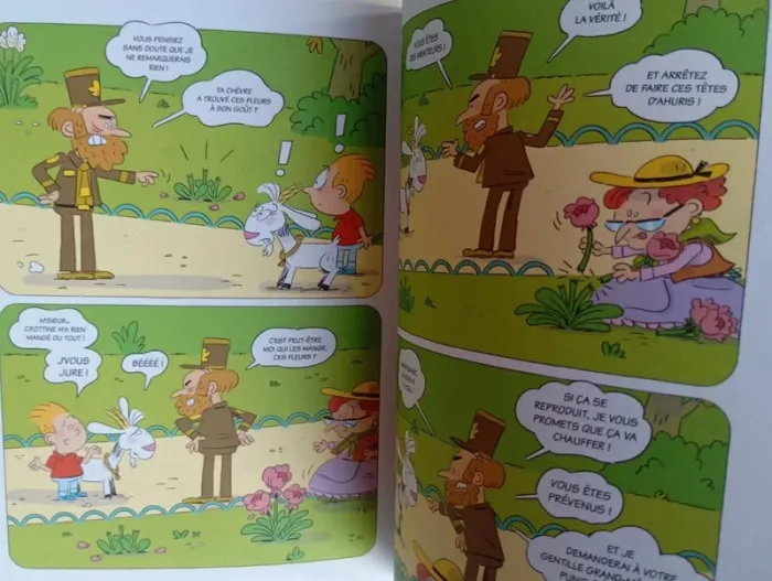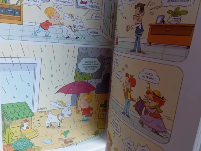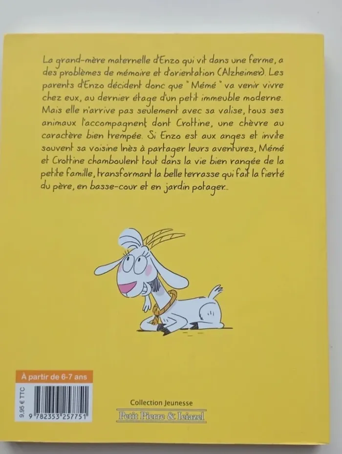 La grand-mère maternelle d'Enzo qui vit dans une ferme, a des problèmes de mémoire et d'orientation (Alzheimer). Les parents d'Enzo décident donc que " Mémé " va venir vivre chez eux, au dernier étage d'un petit immeuble moderne. Mais elle n'arrive pas seulement avec sa valise, tous ses animaux l'accompagnent, dont Crottine, une chèvre au caractère bien trempée. Si Enzo est aux anges et invite souvent sa voisine Inès à partager leurs aventures, Mémé et Crottine chamboulent tout dans la vie bien rangée de la petite famille, transformant la belle terrasse qui fait la fierté du père, en basse-cour et en jardin potager... Éditeur ‏ : ‎ Clair de Lune 78 pages Âge de lecture ‏ : ‎ Dès 6 ans Dimensions ‏ : ‎ 16 x 0.9 x 20.2 cm Livre en très bon état Je vends d'autres bd #phil_peg_bdkids #bdkids #enzoetcrottine #grandmère #chèvre
