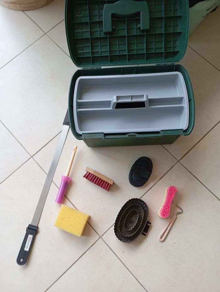 Boîte de pansage pour poney et chevaux plus matériels. Tout est neuf ms resté ds le garage sauf petite étrille noire et cure pieds en très bon état La mallette verte équipée d'un compartiment vous permet de transporter vos brosses et d'isoler les produits de soin. Fonction marche-pied jusqu'à 50 kg Hauteur : 25 cm Largeur : 40 cm Profondeur : 30 cm Couteau de chaleur Pinceau avec capuchon Éponge museau Brosse rose Brosse pour sabot bordeau Étrille métallique cure pieds Étrille plastique