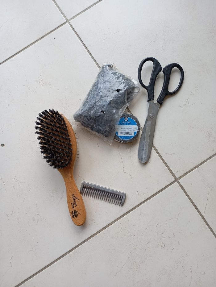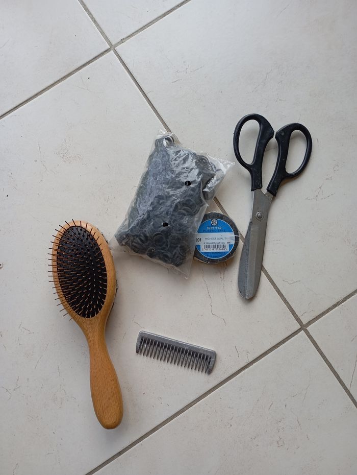 Accessoires de tressage crinière coiffure cheval poney neuf Tout ce qu'il il a sur la photo Ciseaux courbé pour crinière Peigne pour crinière en métal Adhésif à natter Sachet Élastiques à natter crinière Brosse double Mahnen duo Tout est neuf