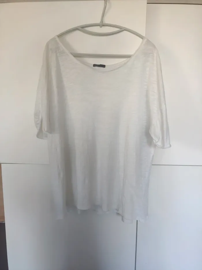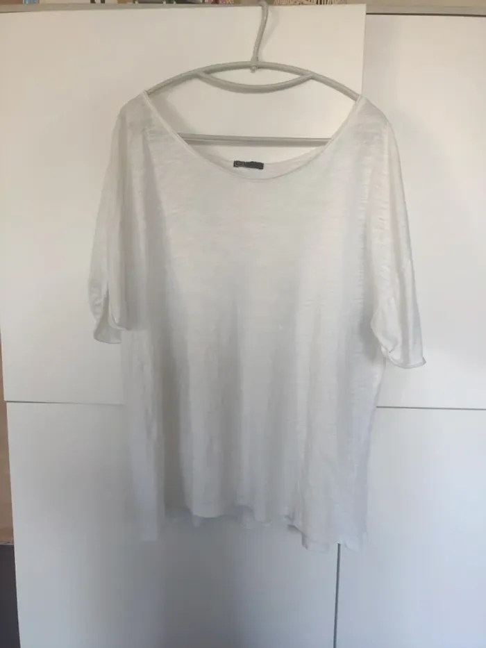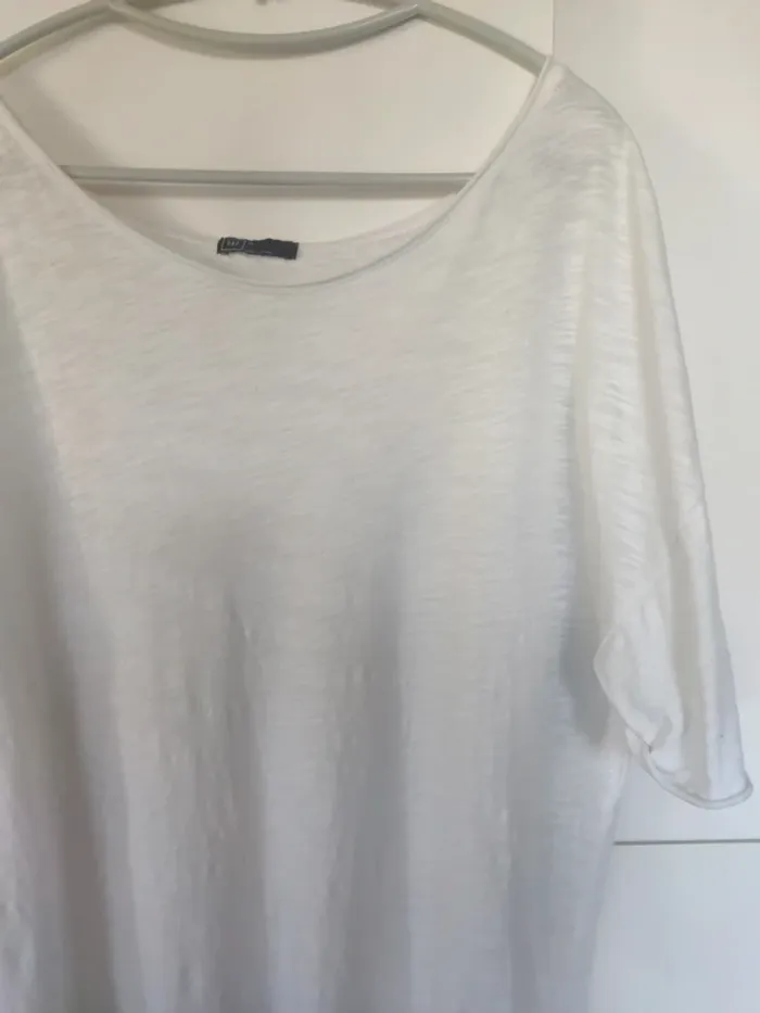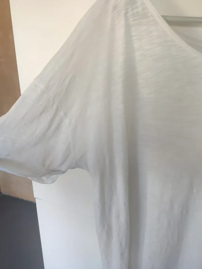 Attention, il y a un petit trou sur l'épaule, voir photos. T-shirt très agréable à porter, j'ai coupé l'étiquette donc je ne sais pas la matière. Semble être du coton avec l'aspect irrégulier du lin. Encolure large, très bon état à part le trou. Hauteur 73 cm. Acheté dans un magasin gap, XL #vulariFemmesXL42 #vulariGap