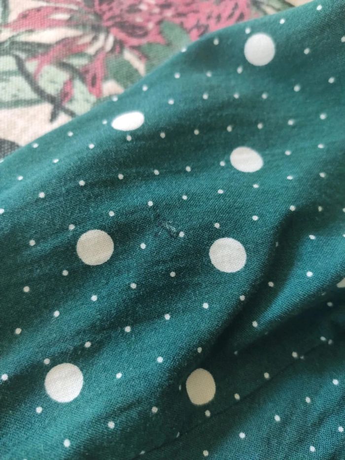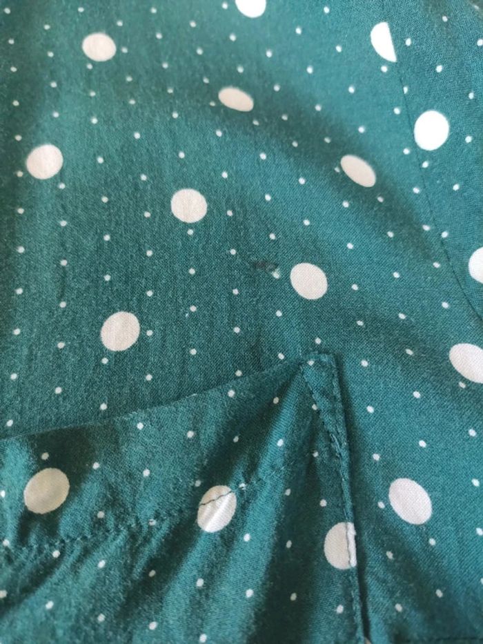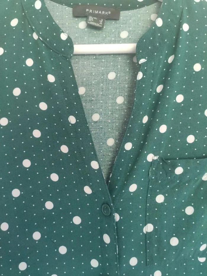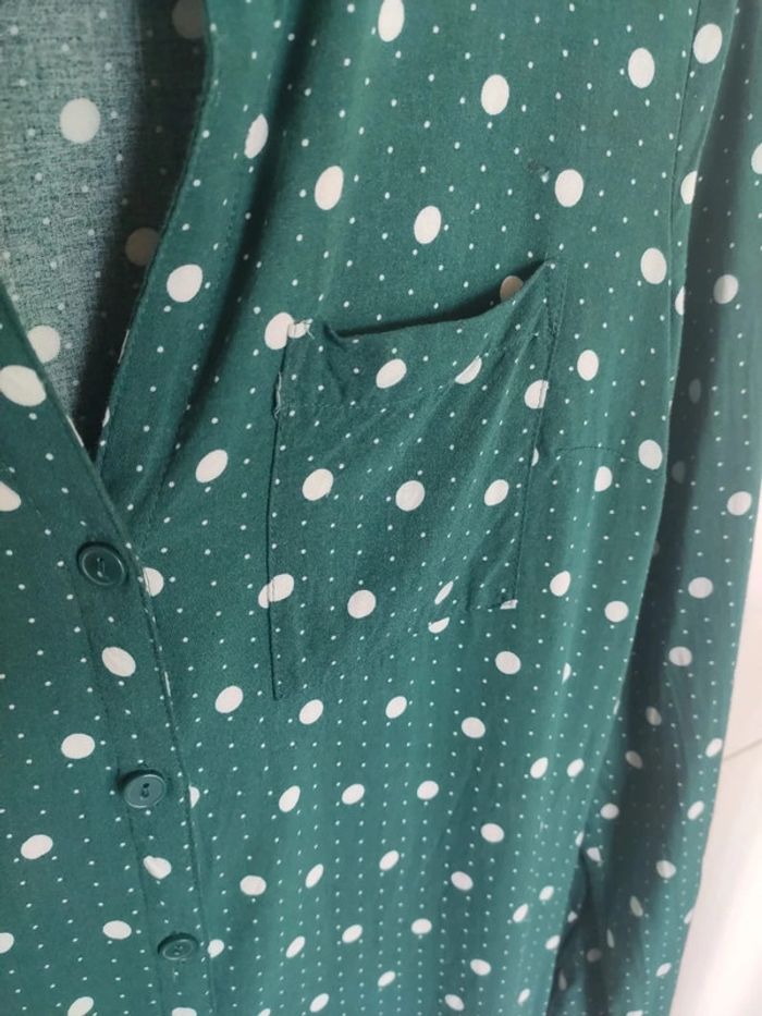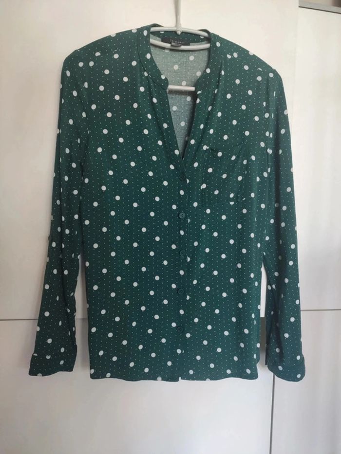 Jolie chemise vert foncé à gros pois blanc et petits pois blancs. Boutonnée mais pas jusqu'en haut, effet col v. Poche poitrine, manches retroussables avec un bouton pour les accrocher. Comme neuve, très peu mise. Taille 34. Il y a des défauts dans le tissu qu'on retrouve a plusieurs endroits, ils sont d'origine ! #vulariFemmesXS34