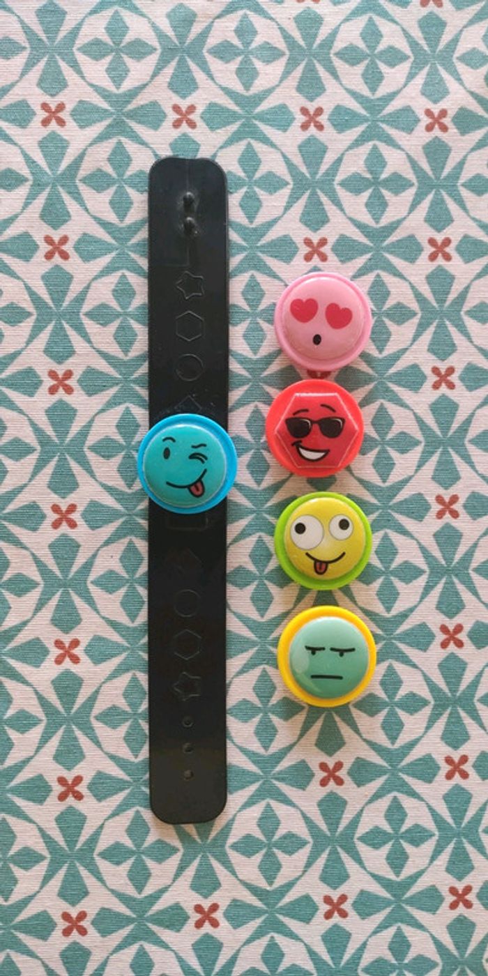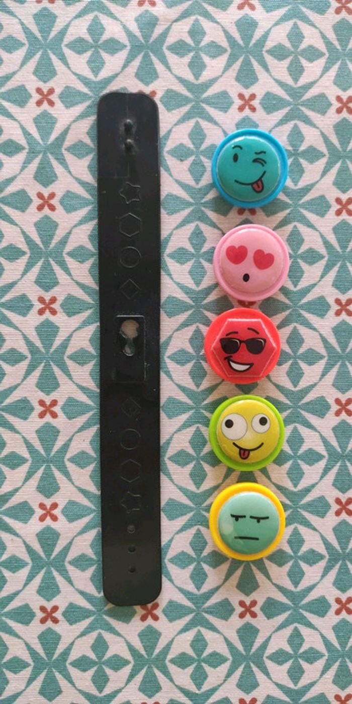 Bracelet noir en plastique sur lequel on peut fixer un smiley, il y a 5 modèles différents. Très bon état