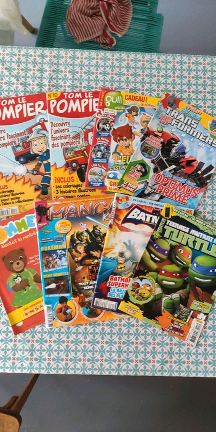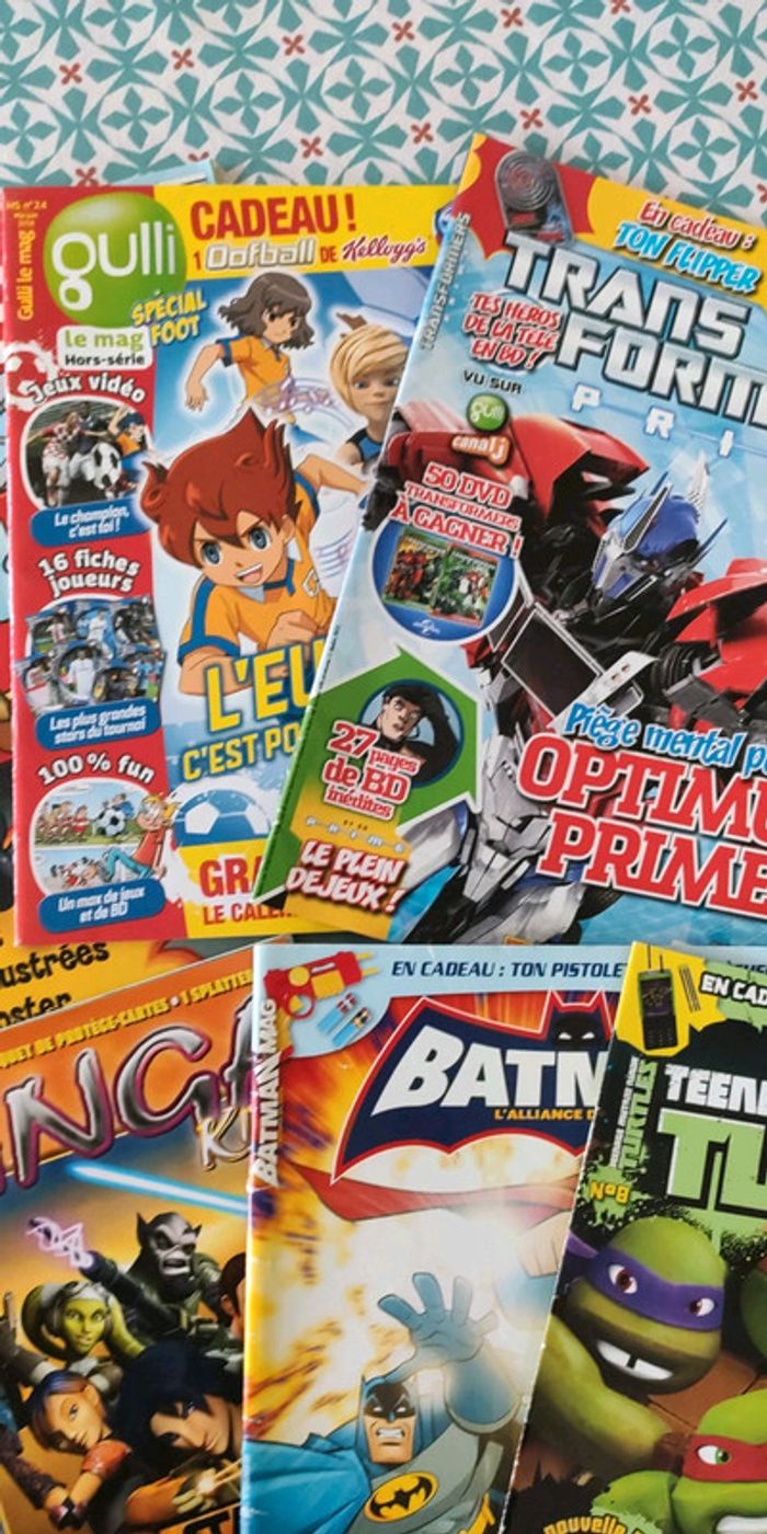 Lot de magazines : Tom le pompier, Gulli, Transformers, tortues ninja, Batman etc Bon état. Ils datent de 2011 a 2016