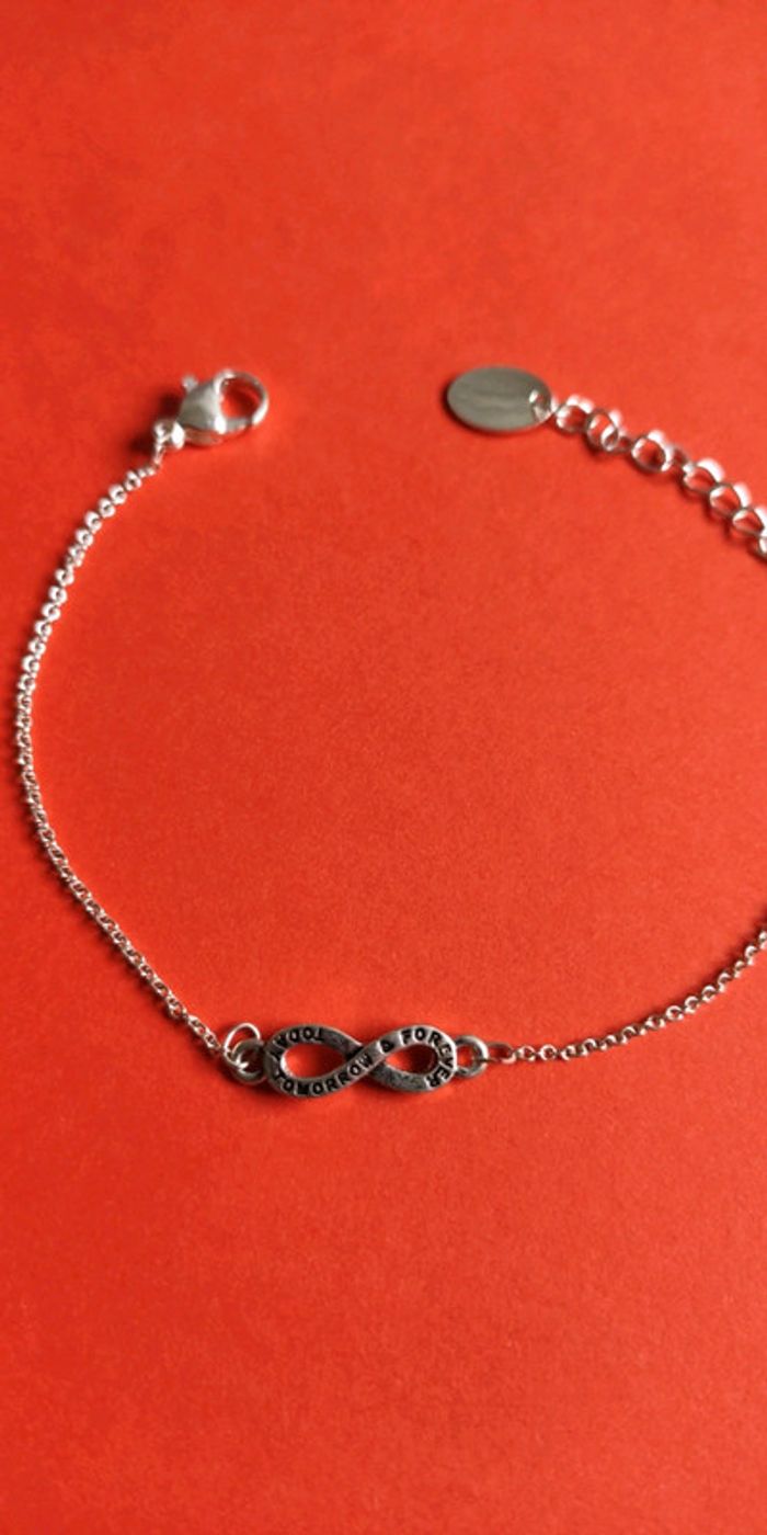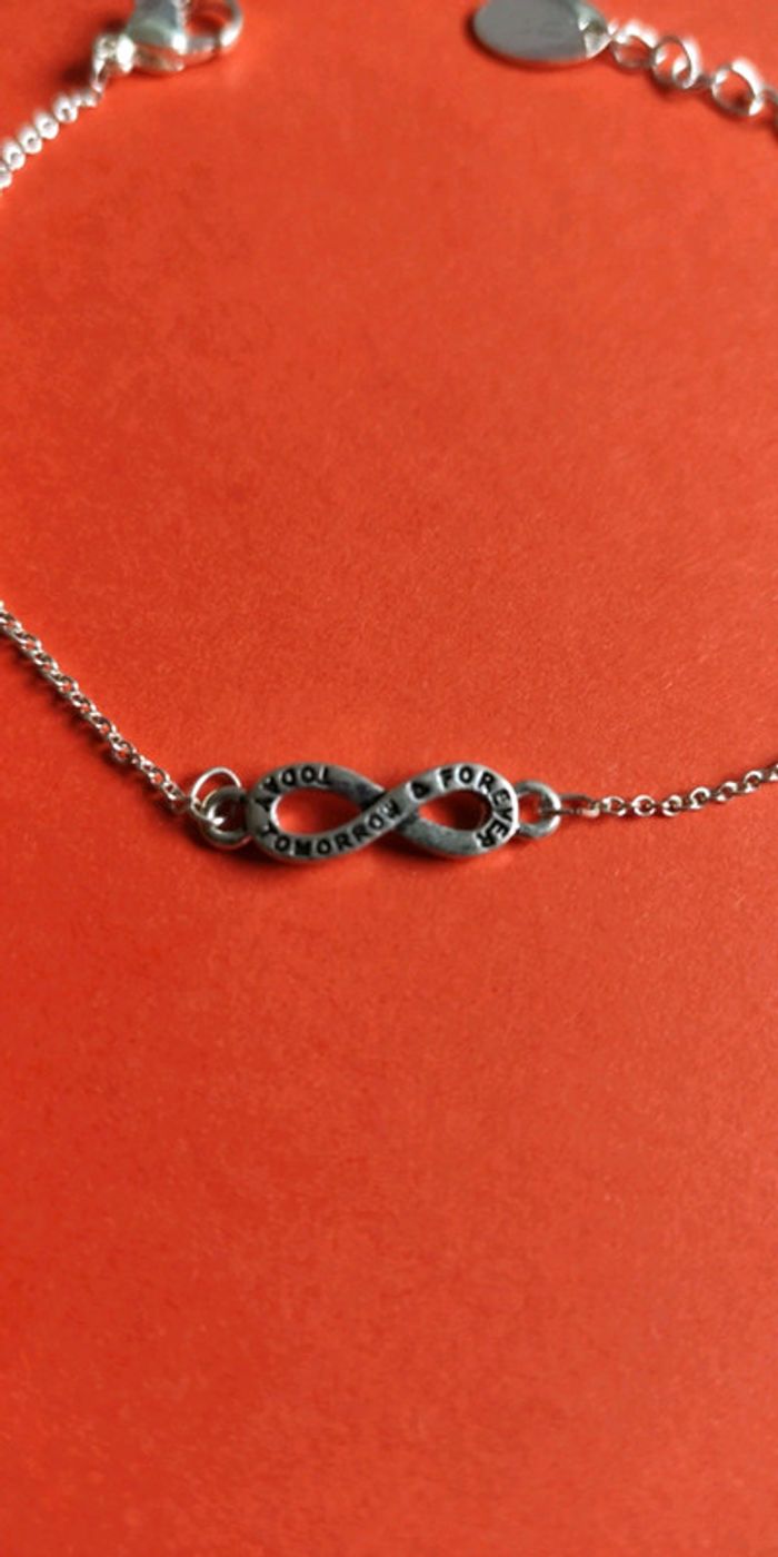 Bracelet style argent acheté chez Claire's Avec le signe infini argenté sur lequel il est écrit "Today Tomorrow & Forever" Fait penser au roman After pour celles qui l'ont lu. Neuf, jamais porté Convient aussi bien aux adultes qu'aux enfants