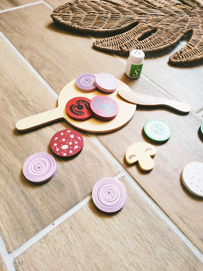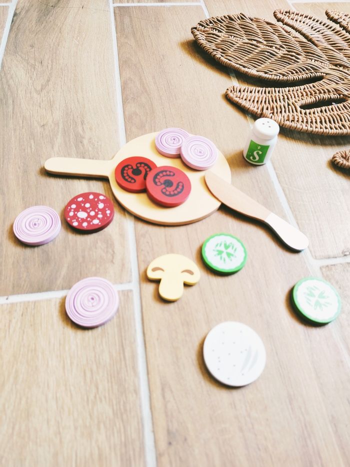 🎀Avec planche, couteau, salière et rondelles de champignons, tomates, saucissons.... En bois