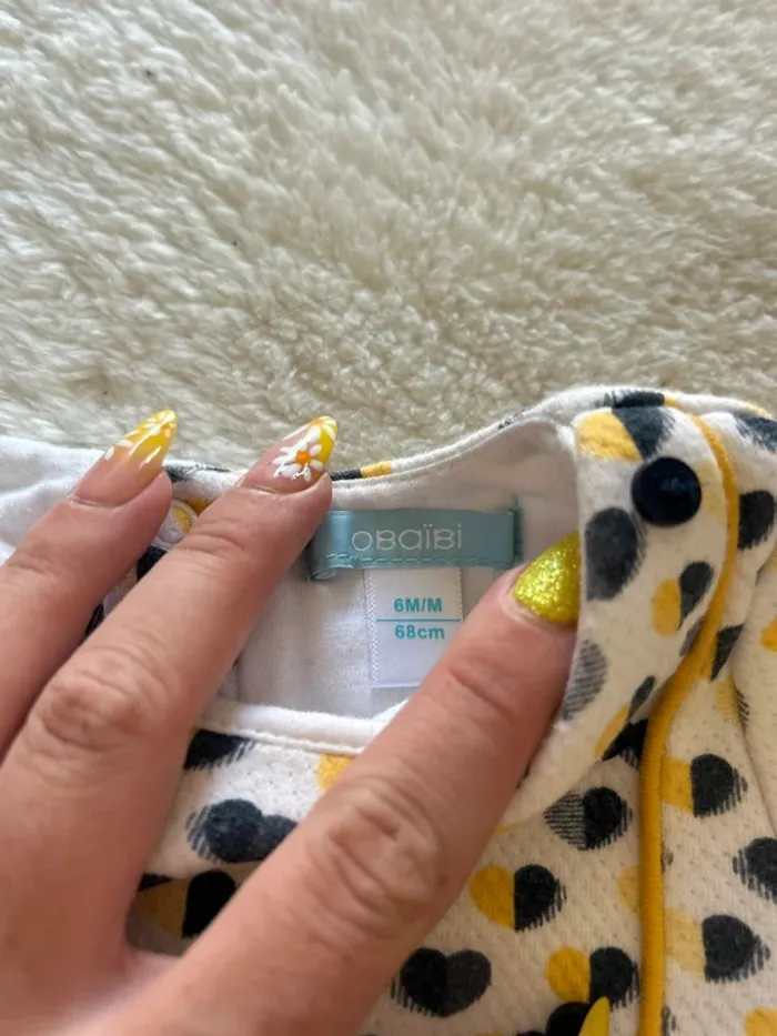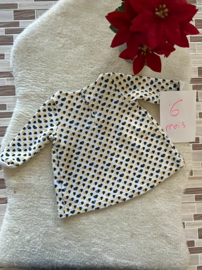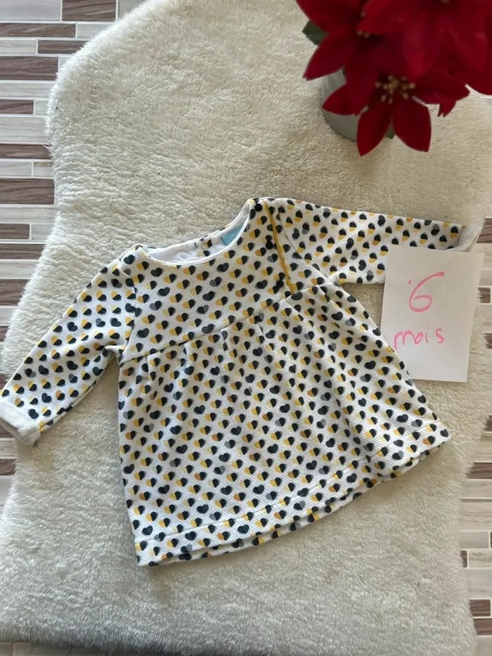 Robe blanche à cœur jaune et bleu marine Taille 6 mois Marque obaïbi En très bon état #charlinelolfille6mois N’hésitez pas si vous avez des questions