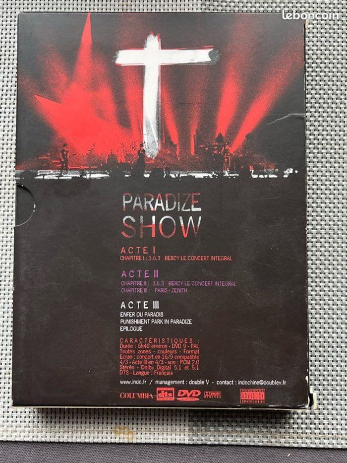 Vends coffret triple DVD du groupe Indochine « Paradize Show, acte I, II, III ». Le coffret présente de légères marques mais rien d’important. Les DVD sont en excellent état. Fonctionnent parfaitement. Il pèse 270g. Idéal pour les fans du groupe, amateurs de musique ou collectionneurs.