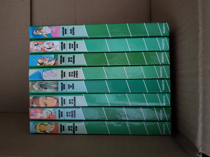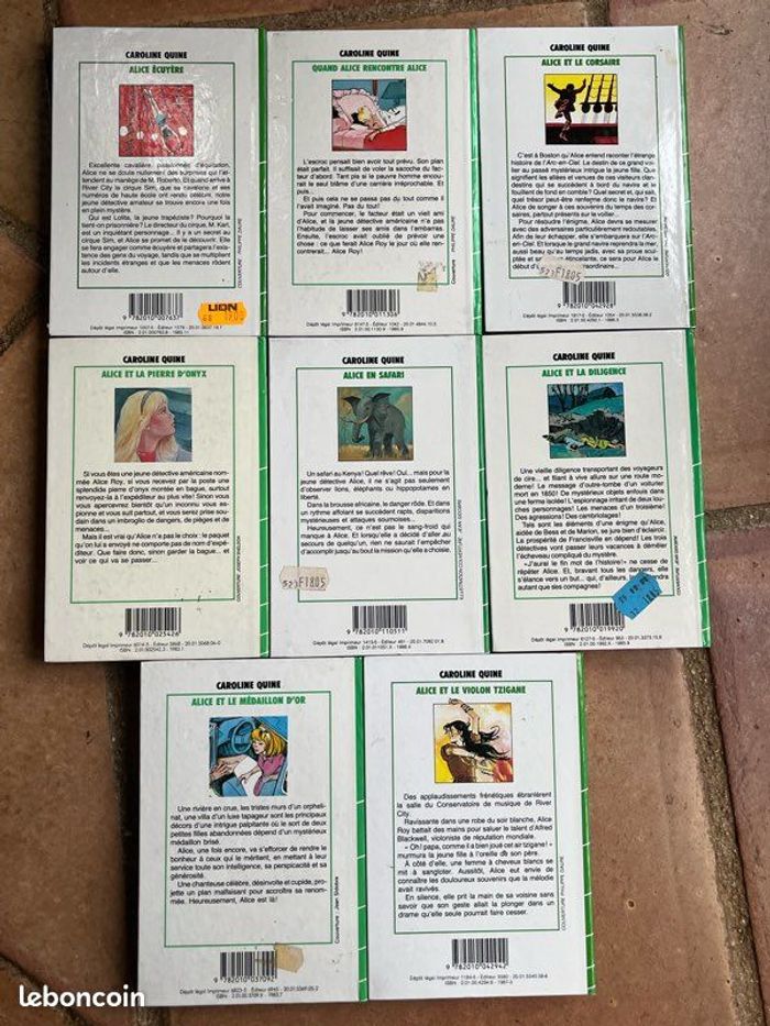 Vends livres de la série « Bibliothèque Verte », sur « Alice » de Caroline Quine. Ils sont en très bon état général. Le lot pèse 1192g. Le prix est celui du lot. Me demander si à l’unité me demander. Les titres sont les suivants : - Alice et le corsaire (1977): pages jaunies et légèrement décollées. Très bon état général - Alice et la pierre d’onyx (1976): typex sur couverture intérieur et stylo sur couverture. Pages jaunies. Mais très bon état général - Alice en safari (1971): pages légèrement décollées et jaunies. Mais très bon état général - Alice et la diligence (1969): excellent état - Alice et le médaillon d’or (1978): pages légèrement décollées et jaunies mais très bon état - Alice et le violon tzigane (1978): pages jaunies et légèrement décollées mais très bon état - Alice écuyère (1959): pages jaunies et léger décollement mais excellent état - quand Alice rencontre Alice (1975): pages jaunies mais excellent état Idéal pour enfants, nostalgiques ou collectionneurs.