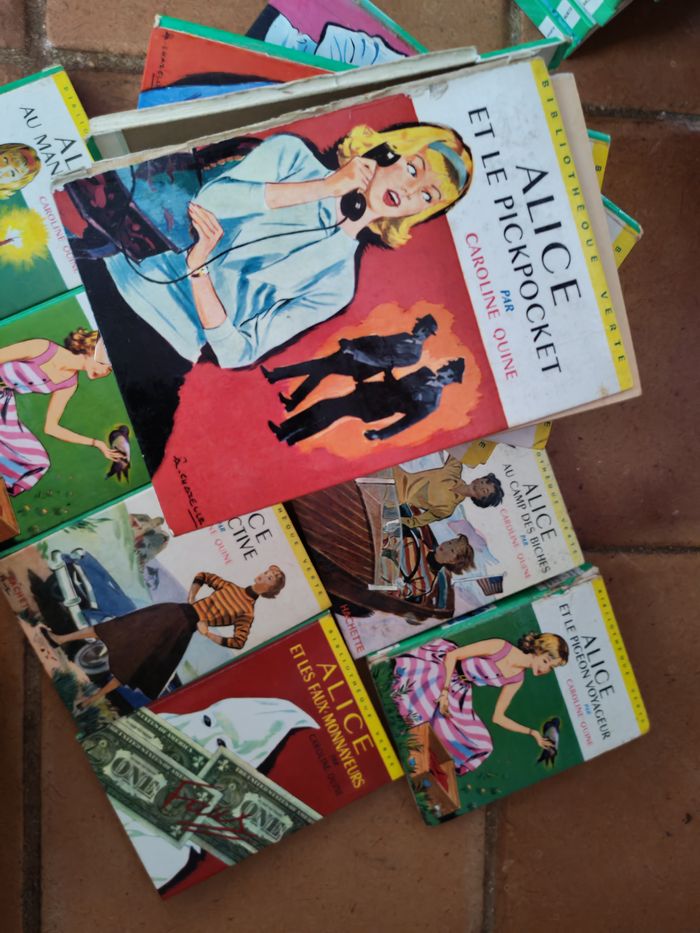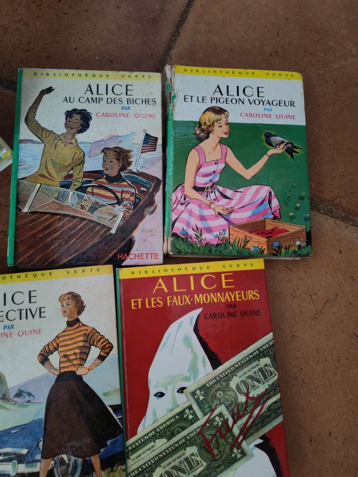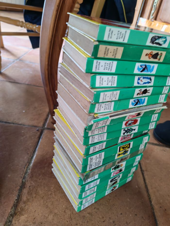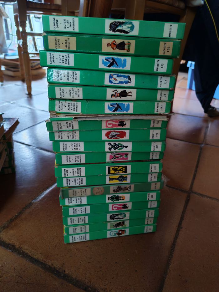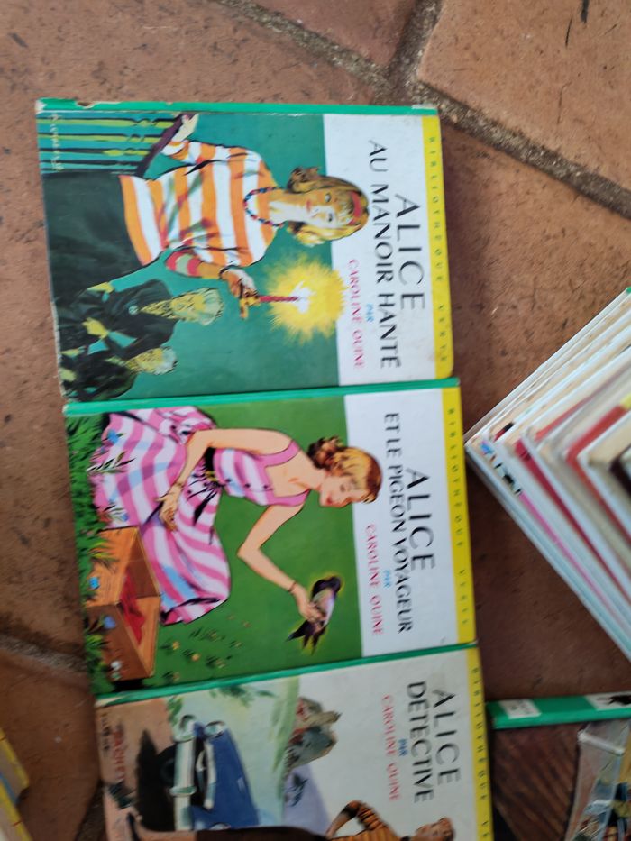 Vends lots de livres de la série « Alice » de Caroline Quine, de la « Bibliothèque Verte » avec bandeau jaune. Le prix est celui du lot, qui pèse 3681g. Me demander à l’unité. Ils ont tous les pages jaunies comme souvent sur cette collection. Les titres sont : - Alice et l’ombre chinoise (1965): très bon état général - Alice et le vase de Chine (1966): excellent état - Alice en Écosse (1966): les pages se décollent, protection plastique collée sur couverture, stylo sur couverture intérieure - Alice et le flibustier (1956): excellent état - Alice et le pickpocket (1963): très bon état - Alice et les faux-monnayeurs (1968): excellent état, pages se décollent - Alice et la diligence (1969): très bon état, pages se décollent - Alice et la malle mystérieuse (1968): excellent état - Alice et le pigeonne voyageur (1961): couverture abîmée notamment sur la tranche, intérieur bon état - Alice et le pickpocket (1963): couverture déchirée au niveau de la tranche, inférieur très bon état - Alice et le talisman d’ivoire (1961): excellent état - Alice et les 3 clés (1965): manque page de garde, couverture légèrement marquée mais intérieur frais - Alice et les diamants (1963): très bon état, pages légèrement décollées - Alice et les faux-monnayeurs (1968): très bon état - Alice détective (1955): stylo sur 1ère et dernière page, pages décollées, mais bon état général - Alice et le pigeon voyageur (1961): parfait état - Alice au manoir hanté (1963): bon état général, stylo couverture intérieure - Alice au camps des biches (1957): très bon état général Idéal pour enfants, nostalgiques, collectionneurs.