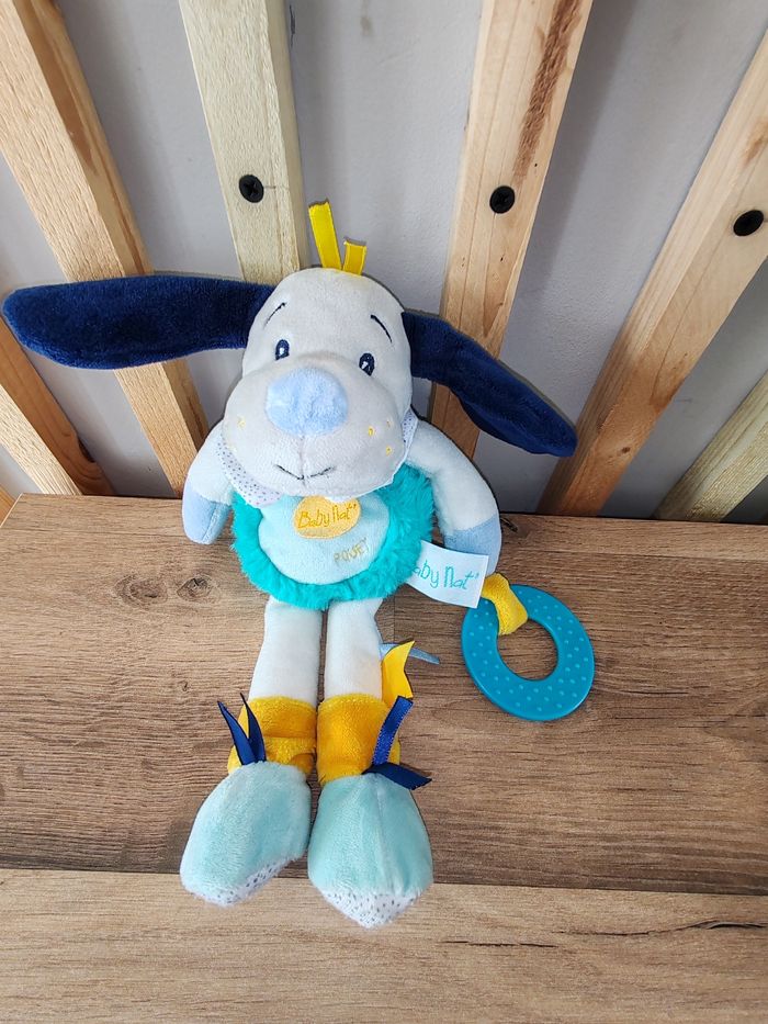 Il est en excellent état Étiquette marque présente Anneau de dentition Chien gris et turquoise Baby'Nat pépin 14.90 euros envoi en relais