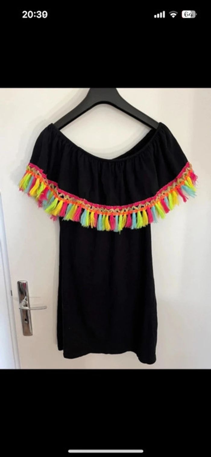 Robe d’été noir épaules dénudés avec petits pompons de couleurs fluo Élastique au niveau des épaules donc ne glisse pas Arrive mi cuisse pour une personne d’un mètre 68 Taille unique Acheté dans une boutique indépendante