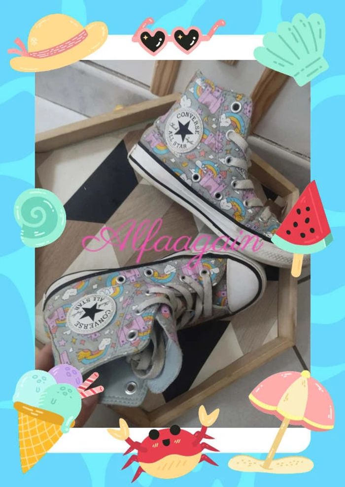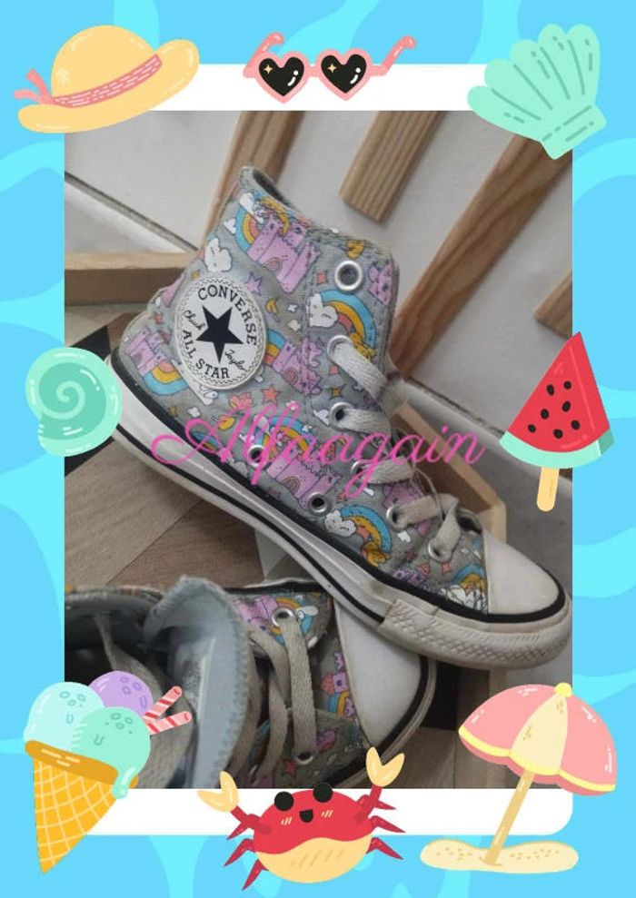 Paire de basket all star grise imprimé châteaux / arcs-en-ciel à lacets très bon état général, portées plusieurs fois. Marque Converse . Taille 30 A vendre 15€ --------------------------- ✏️Informations générales ✏️ 📩Expédition dans la journée en général -hors weekend. 🚭Maison non fumeur / sans animaux 📅Pas de réservation 📸Pas de photo porté 👛 Bon plan Envoi à 99ct (+20% récupéré en bon d'achat) possible uniquement pour les français- me contacter pour plus d'infos 😉 #alfaagain30shoesfille #allstar #converse