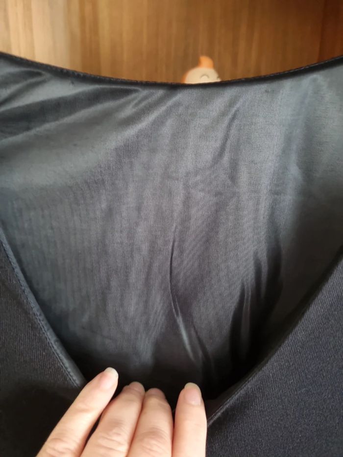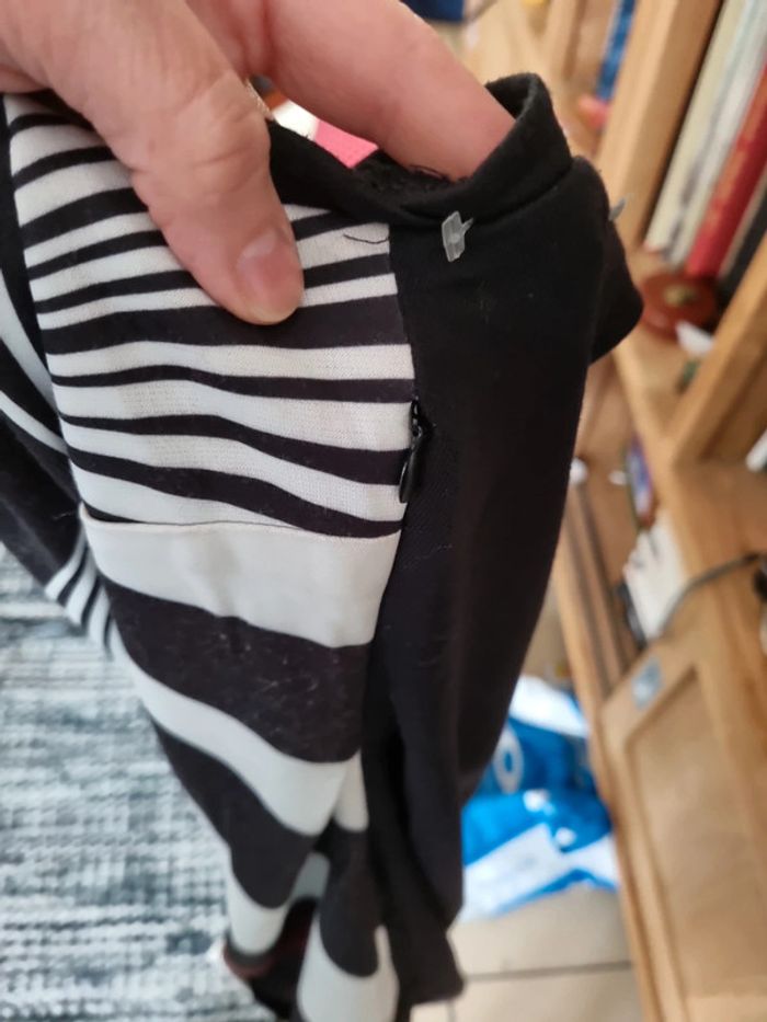 Entièrement doublée Zip invisible sur le côté Décolleté arrondi au dos Citation serigraphiée au bas de la robe Attention pas de vignette interieure