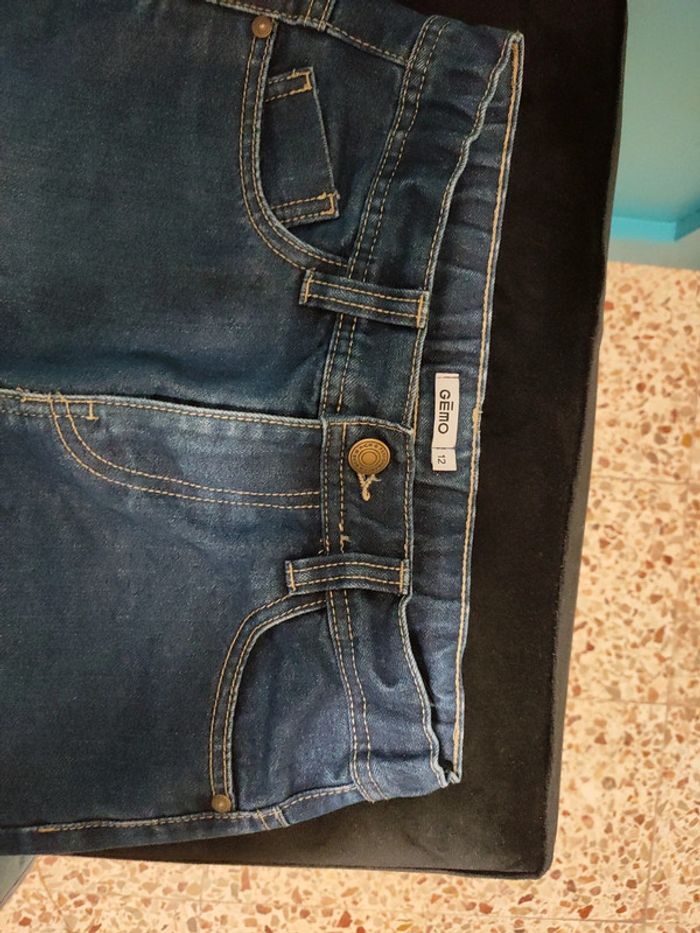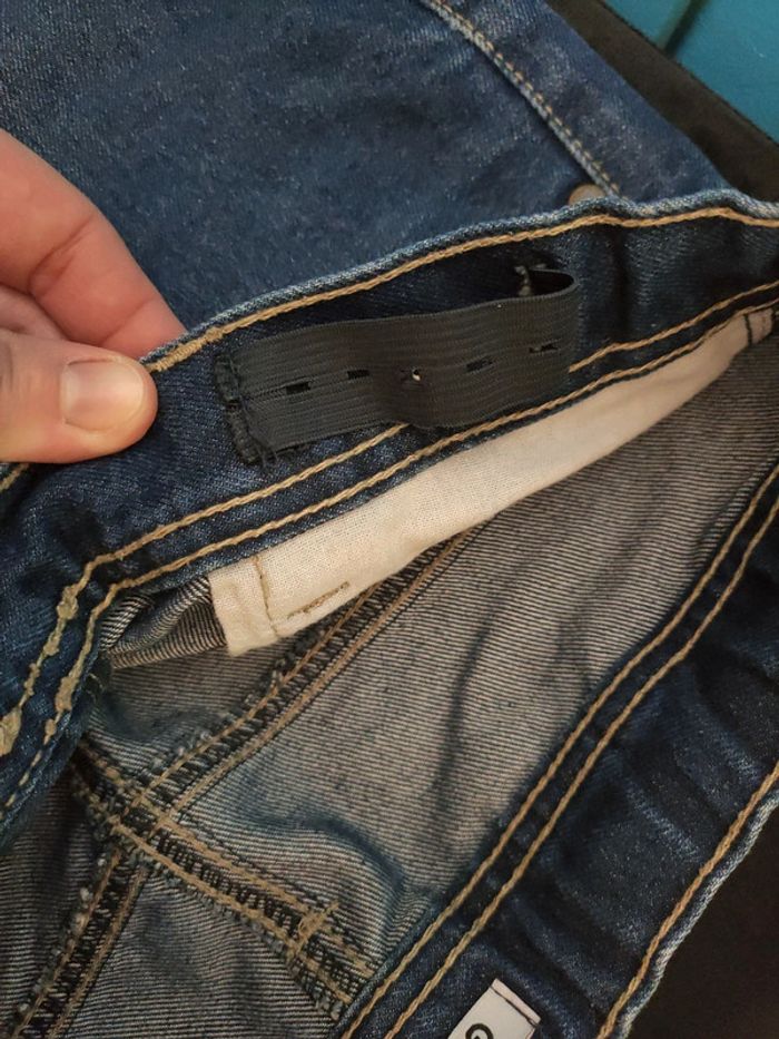 Jean regular bleu foncé Taille réglable Petit défaut un des élastiques pour régler et abîmés sur les 3 premier cran. Mis à part ça pantalon en très bon état. Taille 12 ans Gémo