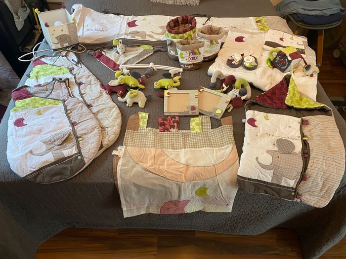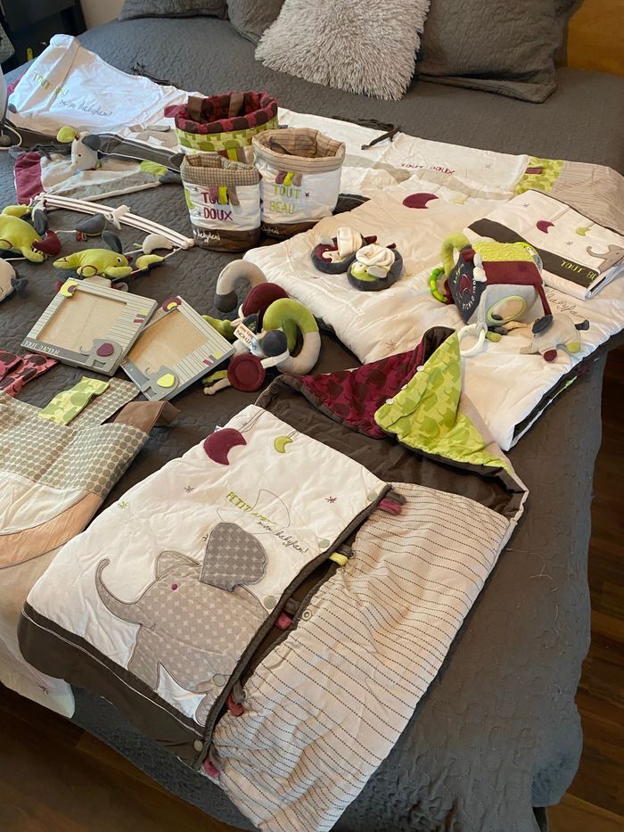 Lot de la collection baby fan de chez sauthon. Bordeaux, vert anis et taupe. Le lot comporte : - 2 gigoteuses (3/6mois et 6-18mois) - 1 nid d’ange - 1 lampe de chevet - 1 tour de lit - 1 édredon pour lit 120/60cm - 1 drap pour lit 140/70cm - 2 cadres - 1 mobile musical - 1 paire de chausson - 1 cube d’activité - 1 doudou carré - 1 rideau - 1 jeu d’éveil pour arche (poussette/cosy/parc) - 1 plafonnier fait main - 1 lot de 3 paniers en tissus pr table à langer L’achat m’a coûté plus de 500€. État impeccable Je vous propose 220€ pr l’ensemble. Possible de choisir 1 ou plusieurs articles, me demander pour le tarif unitaire ;-)